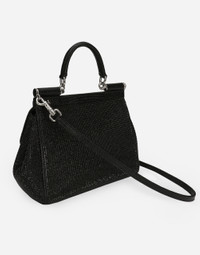 The fusion and alchemy between the history and creativity of D&G’s designers and the contemporary vision of Kim Kardashian, style and beauty icon, lie at the heart of the new Runway collection. The brand’s origins and invaluable archives have been reworked and reinterpreted to imbue Dolce&Gabbana’s signature style with new life. Medium Sicily bag in satin with all-over rhinestones and the palladium-plated metal logo tag: • Black • Front flap with hidden double magnetic fastening • Logo tag featuring two metal plating finishes • Top handle and adjustable, detachable strap in calfskin • Printed fabric lining • Inner pocket • Item comes with a branded dust bag • Measurements: H18.5 x W20 x D10 cm • Made in Italy External composition: 55% Viscose 25% Silk 20% Calfskin Internal composition: 50% Viscose 25% Silk 10% Calfskin 10% Polyamide 5% Polyurethane