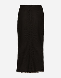 Menswear and womenswear mix and mingle, influencing one another and creating tailoring that embraces endless nuances, from the boldest to the most sophisticated, to define the rules of eternally classy femininity. A monochrome retelling in Nero Sicilia black, embellished by golden touches and rhinestones, adorning clean lines and incorporating stylish fabrics such as velvet, chiffon, lace, organza, and unique mesh details, the expression of authentic beauty for dresses, shirts and accessories. Cotton mesh calf-length pencil skirt: • Black • Regular rise • Tulle lining • Stretch silk crepe de chine underskirt • Rear zipper and hook-and-bar fastening • The piece measures 85 cm from the waist down on a size IT 40 • The model is 175 cm tall and wears a size IT 40 • Made in Italy External composition: 84% Cotton 16% Polyamide Internal composition: 50% Polyamide 46% Silk 04% Spandex