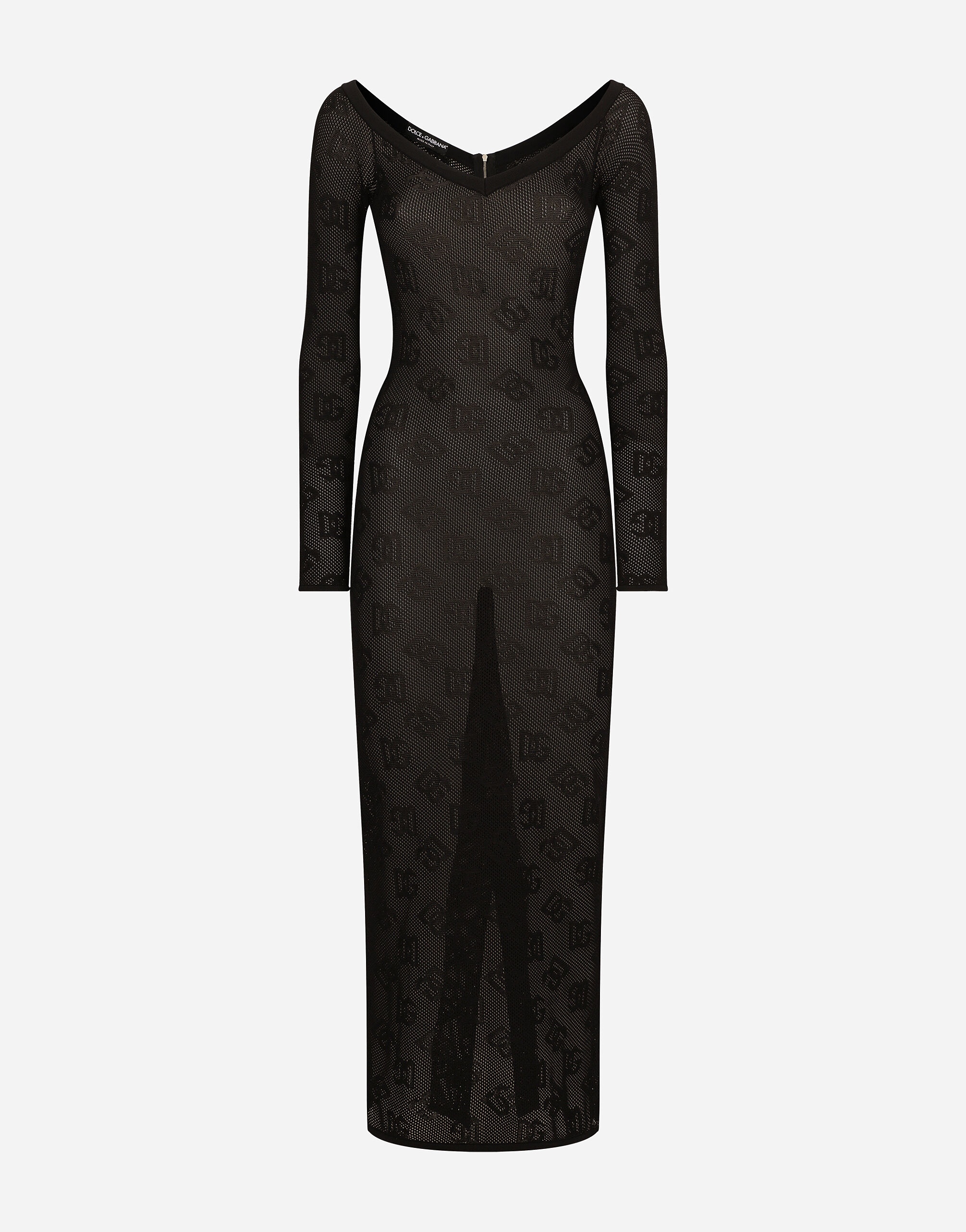 The DNA collection is distinguished by timeless shapes, bringing together three concepts: Sicilian flair, tailoring and sensuality. Nero Sicilia black and optical white predominate and pair with colors that catapult us onto the island of Sicily and make us dream. The designers channel the timeless wardrobe made up of creations that are instantly unmistakable in their simplicity, presenting us with sophisticated beauty loaded with meaning and symbolism that transcends fashion. Mesh-stitch sheath dress with jacquard DG logo: • Black • 18-gauge knit • V-neck • Covered rear slit • Form fitting • Unlined • Zipper and hook-and-eye fastening • The piece measures 132 cm from the shoulder seam on a size IT 40 • The model is 175 cm tall and wears a size IT 40 • Made in Italy External composition: 83% Viscose 17% Polyester