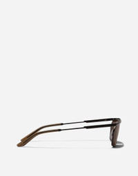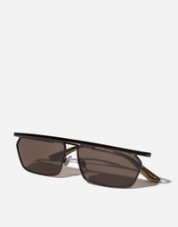 Protagonist of the FW25 men's fashion show, this sleek narrow frame draws inspiration from vintage styles, enhanced by thin metal temples featuring an extended DG logo for a distinctive, elegant touch. The sophisticated bi-color execution, paired with classic masculine tones, completes the look. • Brown metal frame • Brown metal temples with black terminals • Dark brown lenses • 100% UV protection • Size bridge - temple - lens: 14- 145 - 34.8 mm • Fitting: Adjustable nosepads • Packaging: Institutional • Made in Italy