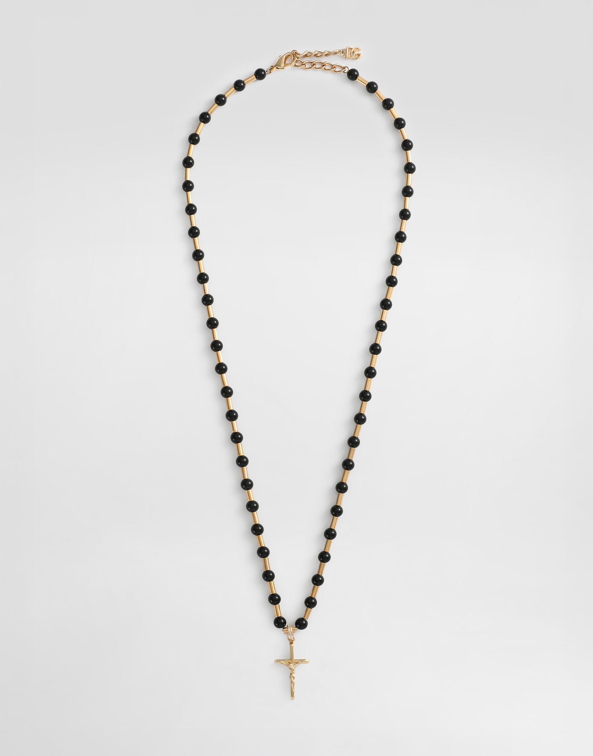 Italy and its beauty are reflected in the Men’s SS25 Collection. Woven raffia and leather give life to jackets, polo-shirts and sweaters to celebrating Italian craftsmanship. The color palette ranges from Nero Sicilia black to burgundy, contributing to conveying a sense of eternal elegance. Refined accessories complement the look: belts and loafers with hand-finished details and oversize bags, such as the Sicily, the Marlene with crocodile-effect print and the versatile Adamo tote. Brass rosary necklace with gemstones and cross pendant: • Black and Gold • Clasp fastening • Length: 60 cm + 5 cm extension • Engraved logo • Nickel-free and hypoallergenic materials • Made in Italy External composition: 80% Brass 20% Acrylic glass