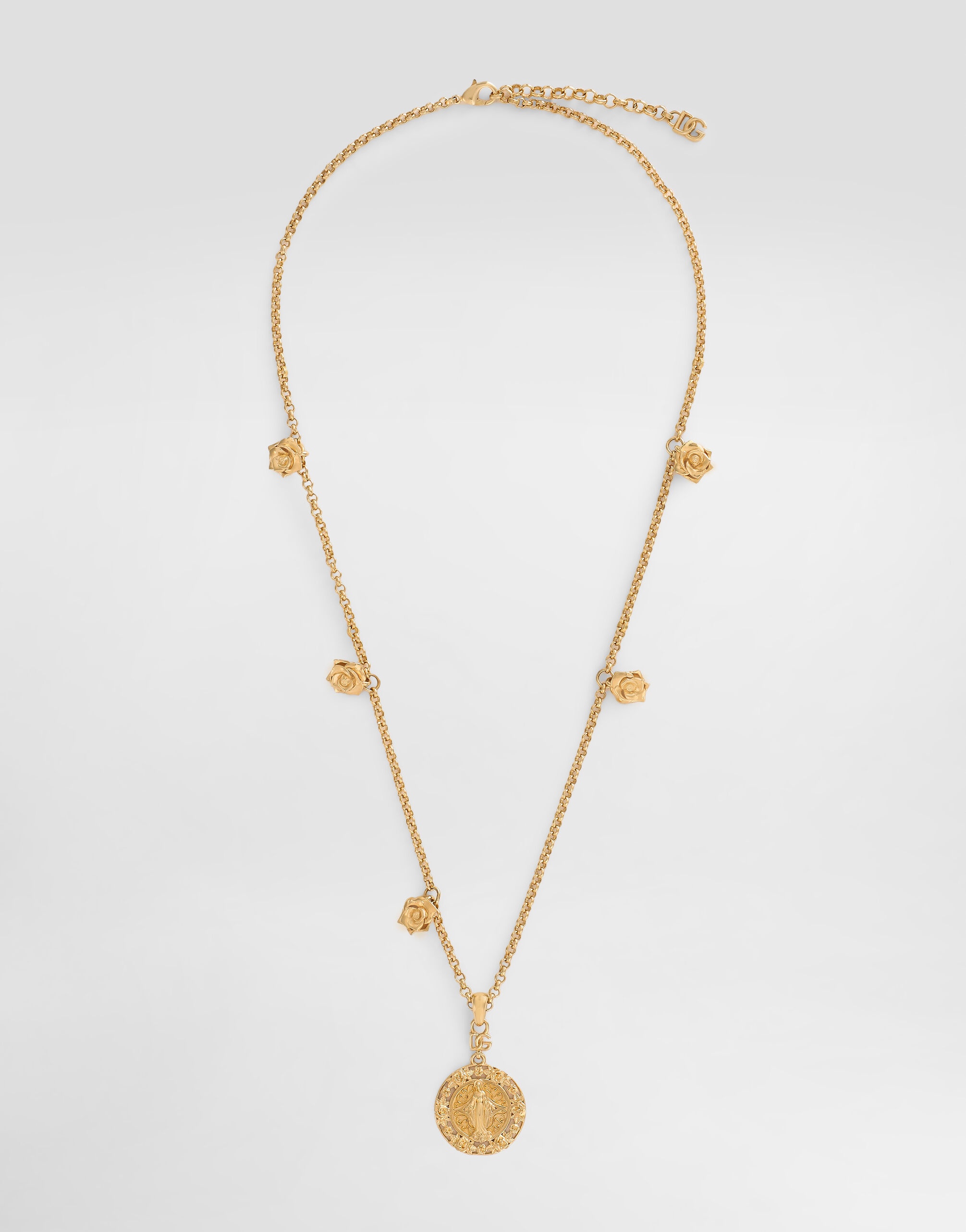 The Italian Holiday Men's Collection revisits 1950s style with a blend of relaxed fits and modern flair. Classic white shirts and tailored suits in refined fabrics contrast with casual denim and playful T-shirts featuring retro graphics with a futuristic twist. Bold prints—chessboards, cats, elegant lighters, and Mediterranean blue ribbons—alongside logo jacquard inspired by ties, infuse a contemporary edge into the essence of Italian holidays. Brass necklace with round accent, roses, leaves and the logo: • Gold • Rolo chain • Clasp fastening • Length: 55 cm + 5 cm extension. • Nickel-free and hypoallergenic materials • Made in Italy External composition: 100% Brass