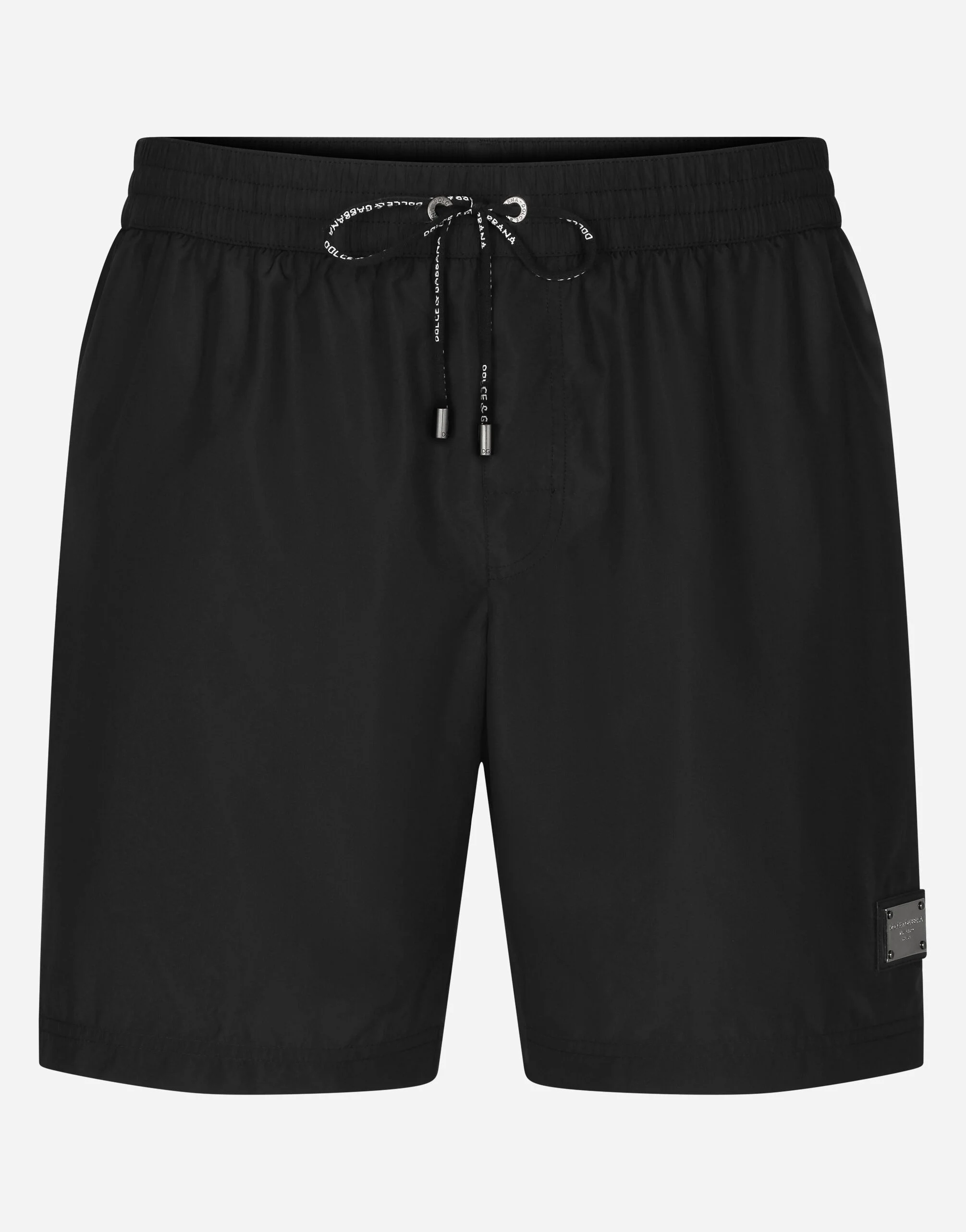 Mid-length light polyester swim trunks with metal Dolce&Gabbana logo tag: • Logo-detailed stretch waistband with a drawstring and nickel-free gunmetal-gray metal aglets • Side pockets and a small zipped pocket on the back • Inner briefs in soft and comfortable fabric • Matching pouch in the same fabric as the garment • The item measures 43 cm on the outer leg on a size IT 4 • Sizes available: from II to VII • Made in Italy Care And Details External composition: 100% Polyester Internal composition: 85% Polyamide 15% Spandex