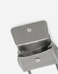 Mini Sicily bag in satin with all-over rhinestones and the palladium-plated metal logo tag: • Front flap with hidden magnetic fastening • Branded tag • Foiled iguana-print calfskin top handle • Palladium-plated metal strap • Satin lining • Item comes with a branded dust bag • Measurements: 9.5 x 11 x 6 cm • Made in Italy Care And Details External composition: 58% Viscose 27% Silk 15% Calfskin Internal composition: 58% Viscose 22% Silk 10% Calfskin 7% Polyamide 3% Polyurethane