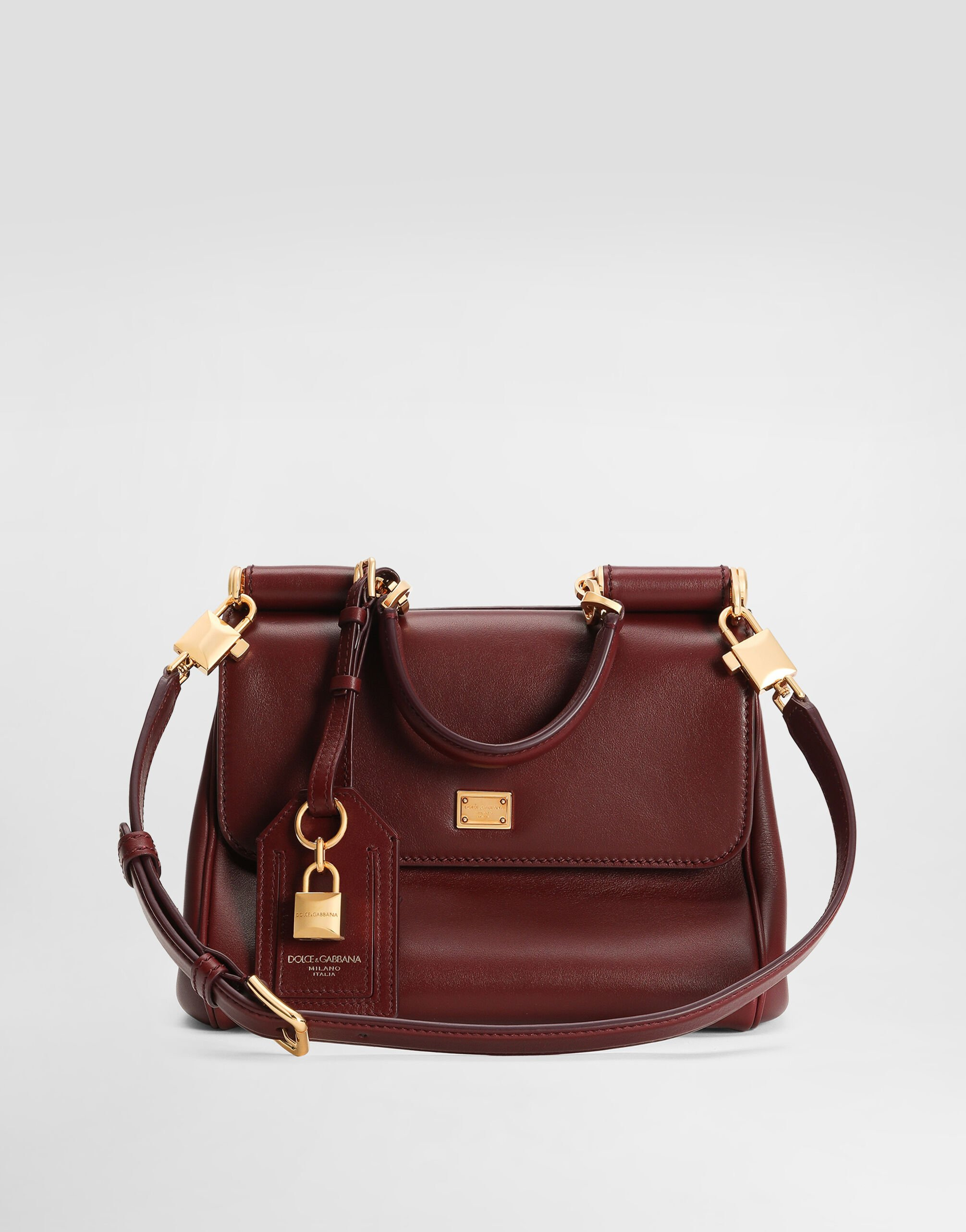 The My Sicily handbag is an expression of timeless elegance, crafted in plonge calfskin with vintage brass details. Perfect for adding a touch of sophistication to your everyday look. My Sicily handbag in plonge calfskin: • Bordeaux • Leather handles and removable and adjustable leather shoulder strap • Tuck-in closure • Vintage brass plating • Monogalvanic plate and stamp with film • Interior with zip pocket • Item equipped with a logo bag and pre-assembled box • Measurements: H19 x W21 x D14 cm • Can hold keys, card holder and phone • Made in Italy External Composition: 95% Calfskin, 5% PVC Internal Composition: 75% Cotton, 15% Calfskin, 10% Acrylic This product is made with leather from tanneries certified according to environmental standards.