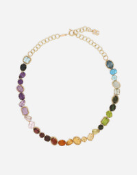 The necklace is made from a chain with twisted links and 30 different gemstones in the colors of the rainbow, featuring different cuts and settings, linked so as to create meticulous sinuosity. • Technical characteristics. Gold 750/000. Length. 41 + 11 cm - 16.1 + 4.3 inches adjustable. • Gems. 2 oval and cushion-cut light blue “Swiss” topaz 2 oval blue “London” topaz, 2 round and teardrop intense purple amethysts, 3 round and teardrop purple amethysts, 1 rectangular pale purple amethyst, 1 teardrop very pale purple amethyst, 1 oval kunzite, 1 oval pink tourmaline, 1 oval red/purple rhodolite garnet, 1 cushion-cut brownish red rhodolite garnet, 1 oval cabochon essonite, 1 oval “Madera” quartz, 1 teardrop citrine, 1 oval “champagne” quartz, 1 round yellow beryl, 1 oval citrine, 1 teardrop “Lemon” quartz, 1 oval green tourmaline, 2 oval bluish green tourmalines, 2 oval and rectangular peridots, 1 cushion-cut green quartz, 2 oval and round “Sky” topaz, 1 baroque South Sea pearl • Made in Italy undefined
