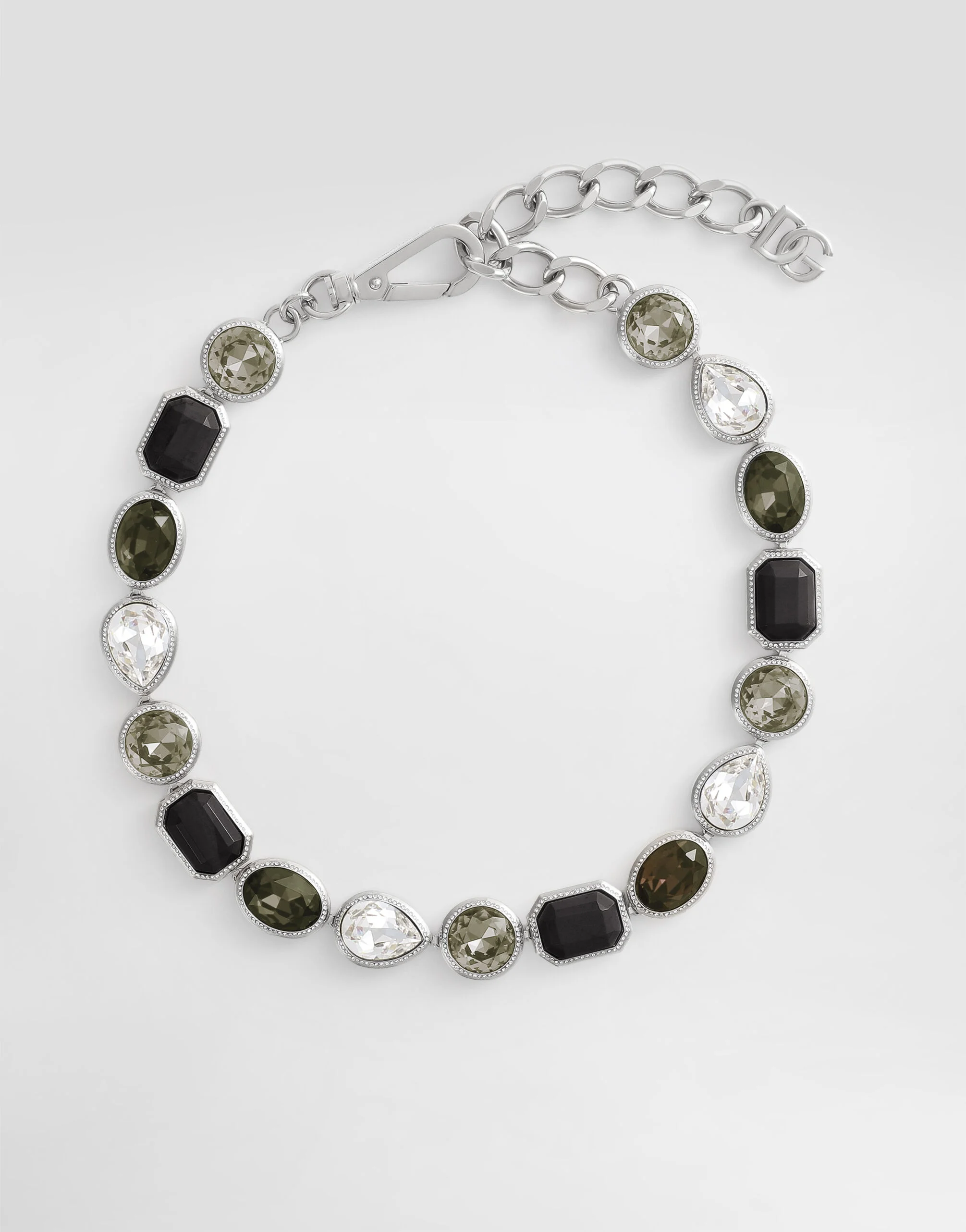 Lightness, Italian aesthetics, and effortless style define the Dolce&Gabbana Men's Spring/Summer 2026 Collection. Pyjamas take center stage, blurring lines between indoor and outdoor spaces with unexpected pairings. Made of striped jacquard cotton, they pair with cardigans, jackets, and sparkling decorations. Relaxed silhouettes, neutral tones with bold contrast details, and iconic accessories complete versatile looks. This rhinestone choker necklace is an elegant and refined accessory, perfect for adding a touch of light and style to your outfits. Necklace with rhinestones: • Silver • Made in Italy External composition: 60% Brass, 35% Glass, 5% Zamak