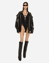 Oversize bullskin jacket: • Black • High neck • Long, detachable sleeves • Zipped armholes • Regular fit • Zipped pockets • Branded stretch satin jacquard lining • Zipper fastening • The piece measures 72 cm from the center back on a size IT 40 • The model is 175 cm tall and wears a size IT 40 • Made in Italy Care And Details External composition: 100% Bullskin Internal composition: 62% Polyester 35% Polyamide 3% Spandex