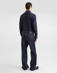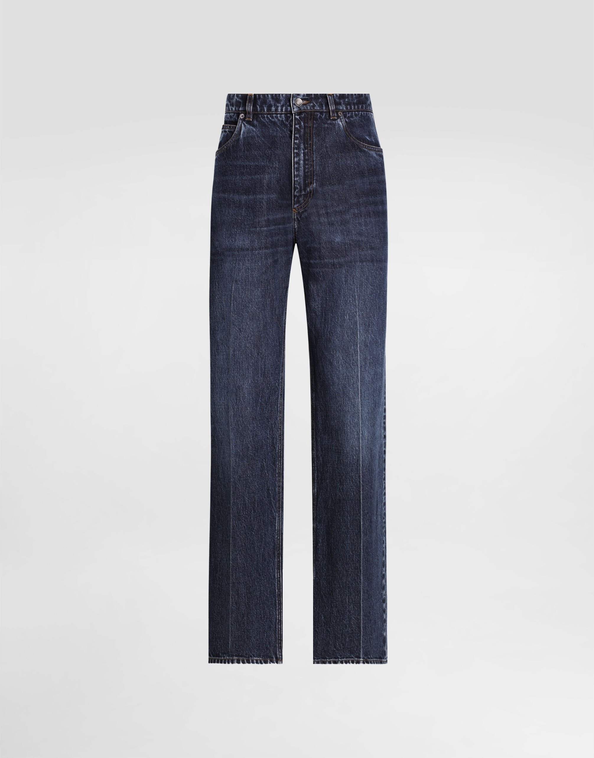 The Italian Holiday Men's Collection revisits 1950s style with a blend of relaxed fits and modern flair. Classic white shirts and tailored suits in refined fabrics contrast with casual denim and playful T-shirts featuring retro graphics with a futuristic twist. Bold prints—chessboards, cats, elegant lighters, and Mediterranean blue ribbons—alongside logo jacquard inspired by ties, infuse a contemporary edge into the essence of Italian holidays. Oversize five-pocket wide-leg cotton jeans with DG logo embroidery: • Blue • Loose fit • Fly-covered zipper and button fastening • Metal Dolce&Gabbana logo tag on the back • The item measures 115 cm on the outer leg and the hem is 26 cm wide on a size IT 48 • Made in Italy External composition: 100% Cotton