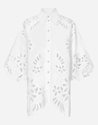 The Italian summers of the 1960s, the candid purity of white, the sophisticated elegance of the jet set of that era. The imagery of the FW24/25 Capri Collection encapsulates all this flawlessly. The pieces range from floaty poplin silhouettes or sack-style dresses and skirts, to brocade outerwear and floral-inlay fabric shirts. The iconic bags – the Logo Bag, the Sicily Bag and the Dolce Box – complement the looks, while the shoes come embroidered with designs inspired by the crystal-clear sea of Capri. Oversize cotton shirt with cut-out detailing: • White • Shirt collar • Wide 3/4 sleeves • Oversize fit • Button fastenings • The piece measures 70 cm from the back of the neck on a size IT 40 • The model is 175 cm tall and wears a size IT 40 • Made in Italy External composition: 100% Cotton