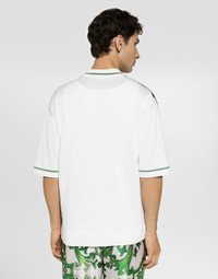 Pictorial, at times volumetric with a textured effect, the decorative “calligraphic-naturalistic” majolica in solid-color green gives life to a collection distinguished by eclectic silhouettes, some stolen from the world of sports, with a cool and light vibe. The vibrant two-tone accenting – green and white – is designed to enhance a series of details, such as the pockets, the green piping paired with the white silk pajamas, the stripes on the polo-shirts, the cuffs on the shirts or the jersey inserts on the T-shirts. Oversize silk and yarn shirt with majolica print: • Green and white • Oversize fit • Kent collar • Short sleeves • Button fastenings • 14-gauge plain knit • The piece measures 72 cm from the shoulder seam on a size M IT • Made in Italy External composition: 77% Silk 20% Cotton 3% Spandex