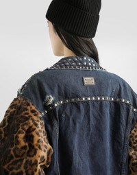 In the Fall/Winter 2025 Fashion Show Collection, shearling jackets, in fur-free versions, reveal slip dresses and create contrast' plays while denim welcomes fabric or Leo print inserts. Sweatshirts are the result of long experimentation with volumes. Evening looks become precious thanks to dresses with special embroideries and luminous touches of sequins and crystals. Sheepskin inserts also unite hats, shoes, and bags, including those with pockets. This denim jacket is the perfect choice for those looking for a versatile and trendy piece. With unique details like embroidery and studs, it's ideal for adding a touch of style to any outfit. Denim jacket: • Multi-colored • Oversized fit • Embroidery and studs • Fur sleeves and cuff • Button opening at center front • The model is 175 cm tall and wears size 40 IT • Lined • Made in Italy External Composition: 60% Cotton, 40% Kid Goatskin Internal Composition: 80% Viscose, 20% Kid Goatskin