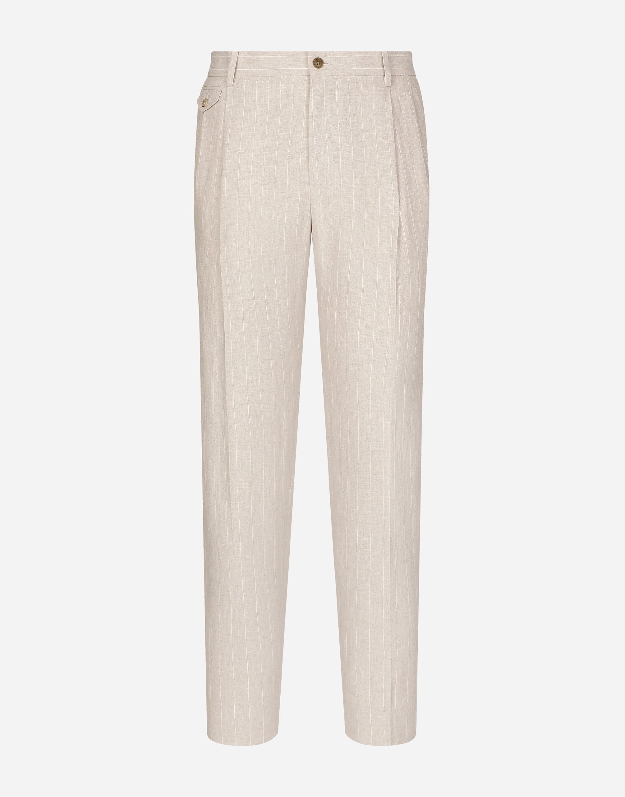 The Palermo collection represents the link between the Sicilian man’s world and the unspoiled nature of the island. A language marked by warm hues – sand, cream, Nero Sicilia black – floral paintings and iconic prints. The Dolce&Gabbana closet must-haves have been reworked in different materials, in pursuit of a new form of harmony. A collection rich in suggestion, such as the stripes inspired by the old mattresses of the 1940s and 1950s, and the timeless aesthetic of the looks. Tailored pinstripe linen pants: • Beige • Regular fit • Belt loops on the waist • Fly-covered zipper and button fastening • Double darts • Front slant pockets, a coin pocket, and buttoned welt pockets on the back • The item measures 105.5 cm on the outer leg and the hem is 18 cm wide on a size IT 48 • Made in Italy External composition: 100% Linen Fiber