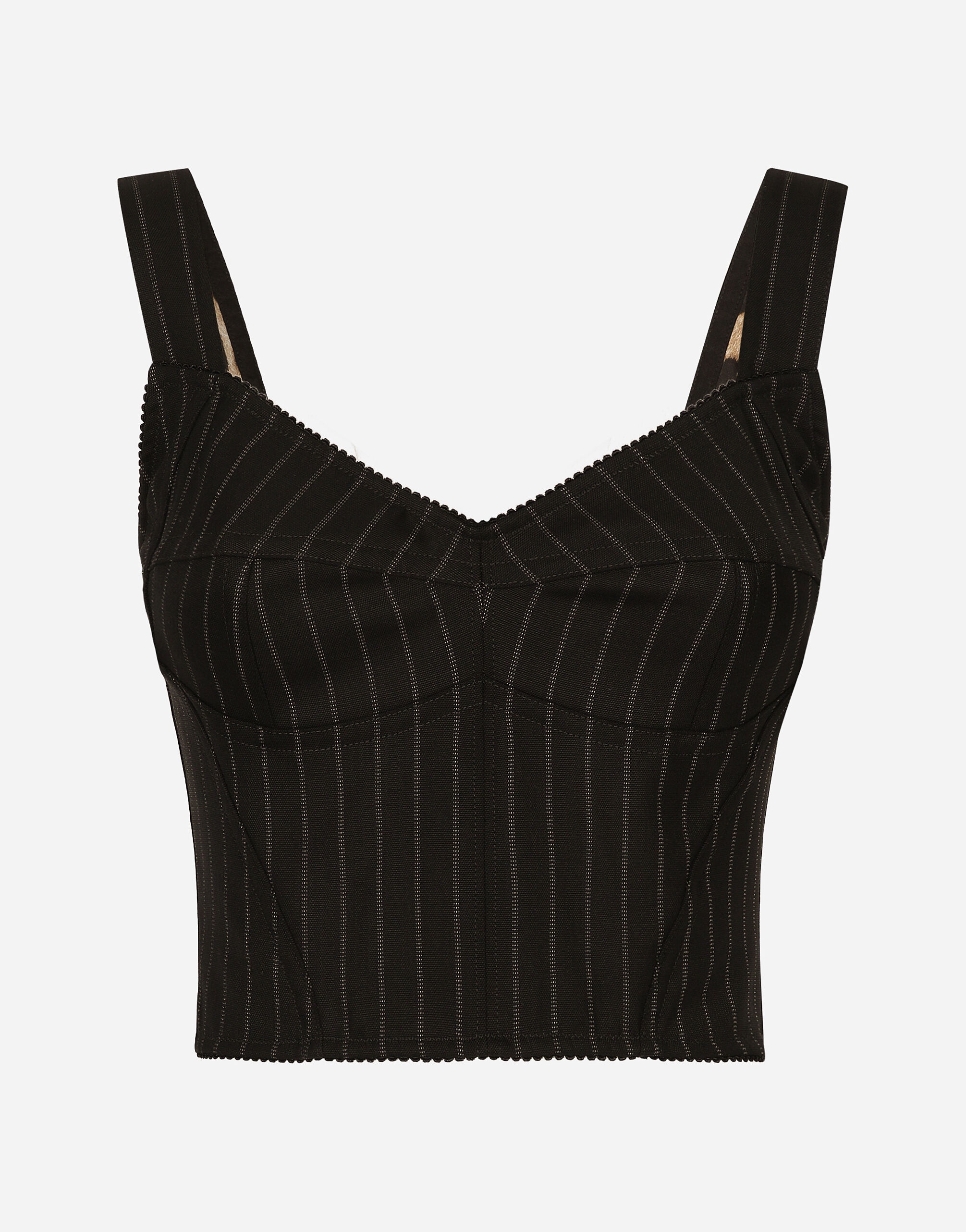 In the Black Sicily Collection, black, the absolute protagonist, becomes sensual black, sheer black, Dolce&Gabbana black. The key concept is “Black on Black”. Playing around with proportions, volumes, layered fabrics and sheer details, this style becomes absolute, bold and sexy. Unique and unmistakable, it is conveyed through the contrasts between glossy and matte fabrics, lines, volumes and special details, thereby expressing a woman’s various personalities and the true identity of Dolce&Gabbana. Pinstripe stretch wool corset top: • Black • Sweetheart neckline • Sleeveless with shoulder straps • Leopard-print stretch silk satin lining • Marquisette back with elasticated insert • Rear zipper and hook-and-eye fastening • The piece measures 42 cm from the center back on a size IT 40 • The model is 175 cm tall and wears a size IT 40 • Made in Italy External composition: 67% Virgin Wool 26% Polyamide 5% Spandex 2% Polyester Internal composition: 93% Silk 7% Spandex