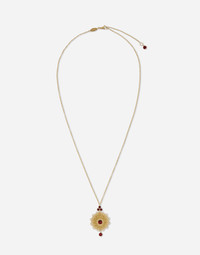 Pendant features extensive outstanding hand-crafted filigree embellishment. a delicate gold wire base houses a series of decorative elements, all shaped by hand by weaving fine granulated wires. • The elaborate ornamental motifs, exceptionally light and delicate despite the intricate overall design, are embellished with six stunning red garnets. An oval plate bearing the "DOLCE&GABBANA" logo has been placed by the closure. Technical specifications. • Gold 18 Kt. Length. 50 + 5 cm adjustable. • Gemstones. 6 round and spherical red rhodolite garnets • Made in Italy Yellow 18 kt Gold