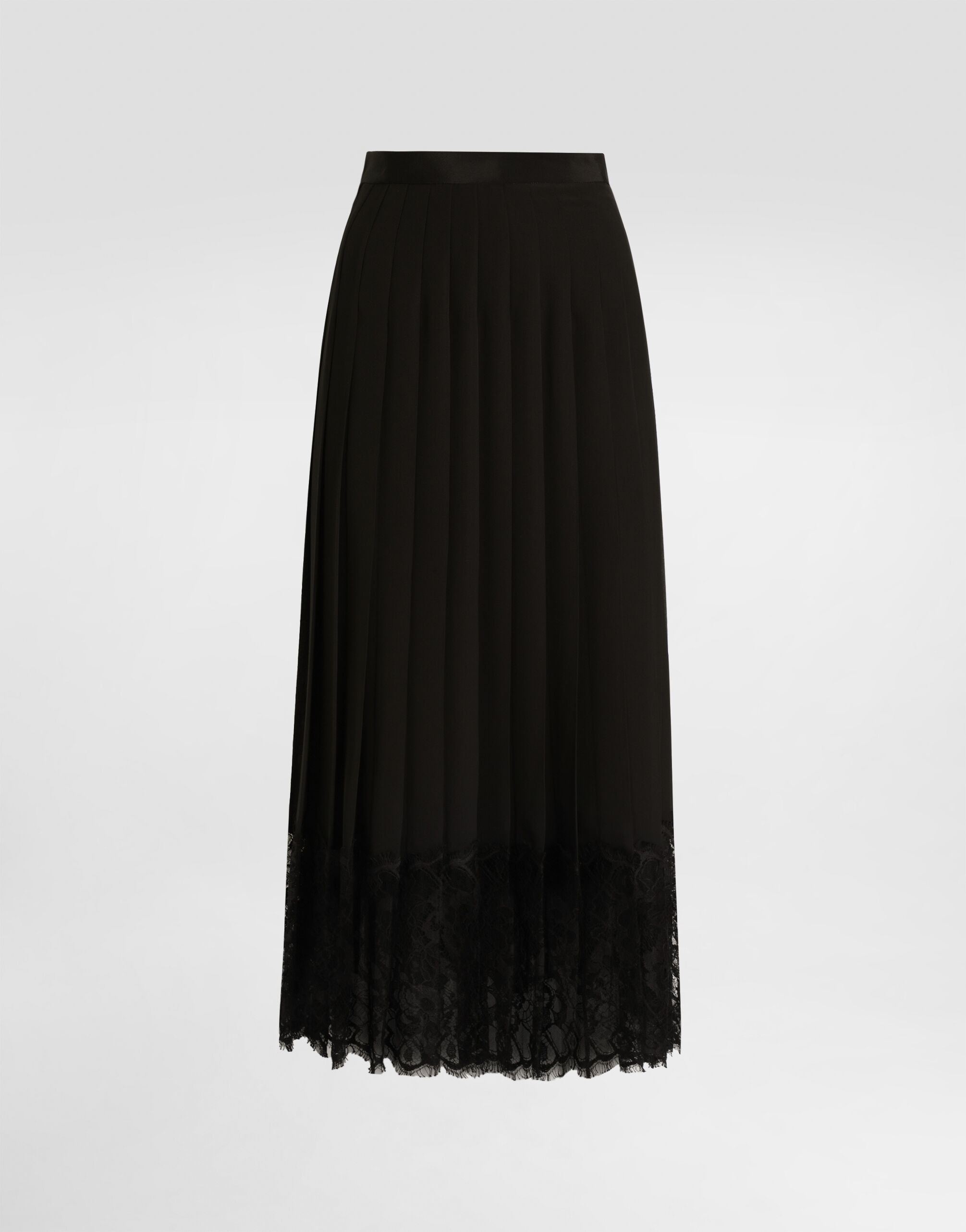 This pleated chiffon skirt is the perfect combination of elegance and modernity. Perfect for a sophisticated look, it stands out for its lace details and careful workmanship. Chiffon pleated skirt: • Black • Covered zip closure at the back • Unlined • Petticoat with lace band at the hem • The model is 175 cm tall and wears size 40 IT • Made in Italy External Composition: 60% Polyester, 24% Cotton, 7% Acetate, 6% Polyamide, 3% Silk Internal Composition: 82% Silk, 8% Elastane, 7% Cotton, 3% Polyamide