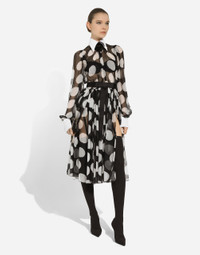 In the “WOMAN SS 24” Collection, the imagery of old Sicily interacts with the masculine, with sensual shapes, lace, nude tones and delicate overlays, to create pieces that move amid clean silhouettes, the elegance of the 1960s, the contrasts of black and white and luxurious textures. The designers are reworking their signature style and their iconic Sicilia black color to convey an aware, seductive and confident Sicilian WOMAN who is imbued with sensuality. Polka-dot chiffon calf-length dress with piqué details: • Multi-colored • Piqué shirt collar with flower detail • Long sleeves with piqué cuffs • Stretch silk crepe de chine slip • Zipper fastening at the back • The piece measures 75 cm from the waist down on a size IT 40 • The model is 175 cm tall and wears a size IT 40 • Made in Italy External composition: 84% Silk 10% Cotton 06% Polyester Internal composition: 91% Silk 09% Spandex