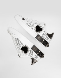 Calfskin sneakers: • Multi-colored • Portofino Spoiler shape • TPU outsole • Polyurethane fussbett insole wrapped in leather and customized with label • With patch, studs and print • Item equipped with a black cotton bag and a box made of recycled paper cellulose fiber • Sole height 15 mm • Made in Italy External Composition: 70% Calfskin, 10% Silk, 5% Cotton, 5% Polyester, 5% Polyurethane, 5% Viscose Internal Composition: 70% Lambskin, 20% Goatskin, 5% Polyester, 5% Natural Rubber