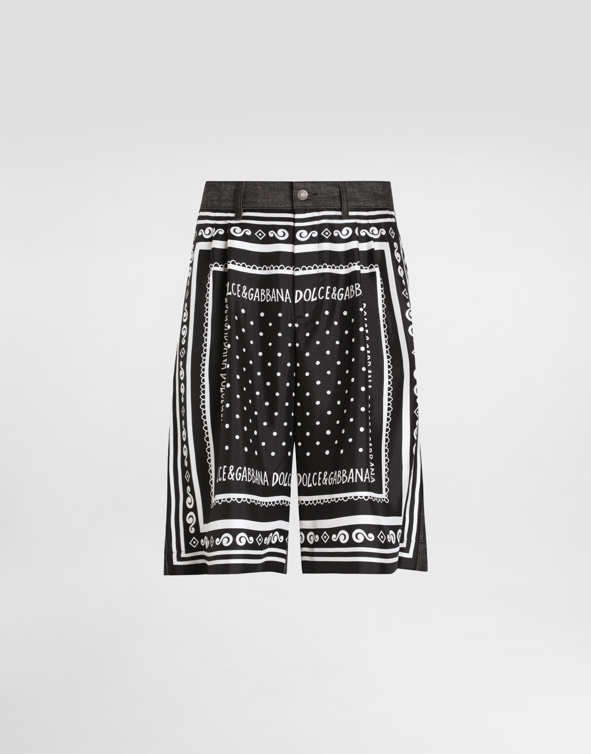 The DNA Men's Collection reimagines daily wear with bold contrasts, meticulous details, and innovative silhouettes. Outerwear stands out with clean lines and high-tech materials, merging sportiness with sophistication in sweaters, sweatshirts, and trousers. A striking color palette, including Black Sicily, caramel, cream, burgundy, and stone gray, pairs with iconic prints like Leopard and Polka dots, enhancing the collection's authentic and refined look. Bandanna-print shorts in cotton denim and silk twill: • Black • Regular fit • Fly-covered zipper and button fastening • Front slant pockets and back pocket • The item measures 60 cm on the outer leg and the hem is 34 cm wide on a size IT 48 • Made in Italy The difference in the print placement that you may find on this product is a feature of Dolce&Gabbana’s “Handmade” pieces. A detail that makes every garment or accessory unique and exclusive. External composition: 55% Cotton 45% Silk