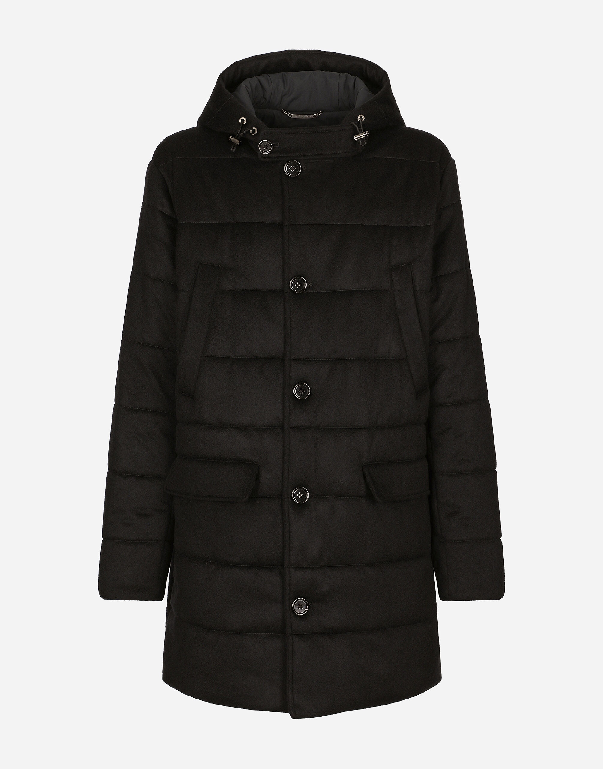 Quilted cashmere parka with hood and metal Dolce&Gabbana logo tag: • Black • Drawstring hood • Front zipper and button fastening • Outer welt pockets with concealed press-stud buttons and inner pockets with zipper • The piece measures 92 cm from the rear collar seam on a size IT 48 • Made in Italy Quilted cashmere parka with hood and metal Dolce&Gabbana logo tag: • Black • Drawstring hood • Front zipper and button fastening • Outer welt pockets with concealed press-stud buttons and inner pockets with zipper • The piece measures 92 cm from the rear collar seam on a size IT 48 • Made in Italy External composition: 100% Cashmere Internal composition: 100% Polyester