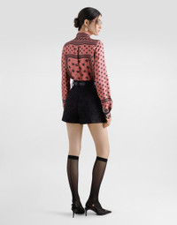 The Women’s DNA Collection is introducing a new side to femininity, which comes in shades of rose quartz, poised between sheerness and opacity, lightness and structure, formality and sensuality. Geometric Dolce Jackets, jacquard pajamas and floral brocade dresses intertwine with ultra-romantic designs. The DG print becomes an iconic statement, while Cordonetto lace and hints of Sicily Black embody the essence of a determined yet romantic femininity. Quilted floral jacquard shorts with DG logo: • Black • Regular rise • Slant pockets • Belt loops • Inner leg: 4.7 cm • Hem: 33 cm • Zipper and cannete-covered button with DG logo • The model is 175 cm tall and wears a size IT 40 • Made in Italy External composition: 49% Cotton 32% Polyester 19% Silk
