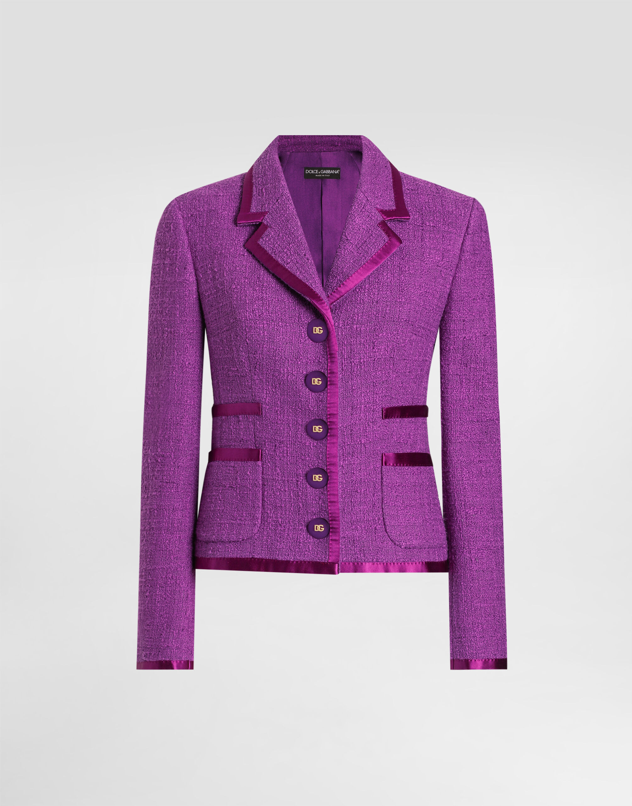 This elegant Rachel jacket is a perfect blend of classic style and modern details, ideal for adding a sophisticated touch to your wardrobe. Rachel tweed jacket: • Violet • Lapel neckline • Patch pockets at the front • Non-functional duchesse pockets • Fasten with 5 buttons and poussoir • Lined • The model is 175 cm tall and wears size 40 IT • Made in Italy External Composition: 81% Cotton, 9% Viscose, 8% Silk, 2% Polyester Internal Composition: 92% Silk, 8% Elastane