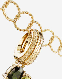 Attention to detail, chromatic harmonies, craftsmanship and a pinch of playful lightness narrate a new chapter of Dolce&Gabbana Fine Jewellery. the Alphabet Collection is the new line inspired by the fascinating power of letters which, from initials of a name, can be transformed into words and messages, with endles combinations. The yellow gold charm is enriched by a veritable rainbow of natural gemstones such as topaz, garnet, amethyst, citrine, peridot and tourmaline. the shades of their colours, dominated by blue, green, purple, red, pink and yellow, evoke the warm atmospheres of Sicily. The multiple shapes of the crystals are also emphasized by the bezels, which alternate twisted thread processing and smooth surfaces. Technical specifications. • Gold 18 Kt. • Gemstones. 1 rectangular with removed sharp corners dark purple amethyst, 1 square cushion light blue “Swiss”topaz, 1 round light blue “Sky” topaz, 1 oval green tourmaline, 1 oval yellowish green peridot, 1 square cushion yellow citrine, 1 rectangular with removed sharp corners orange “Madera” quartz, 1 oval cabochon orangish red hessonite garnet, 1 pear pink tourmaline. • Made in Italy. Complete your look with the twisted wire yellow gold chain and compose your own favourite word. Suggested distance between letters is 5 rings. Yellow 18 kt Gold