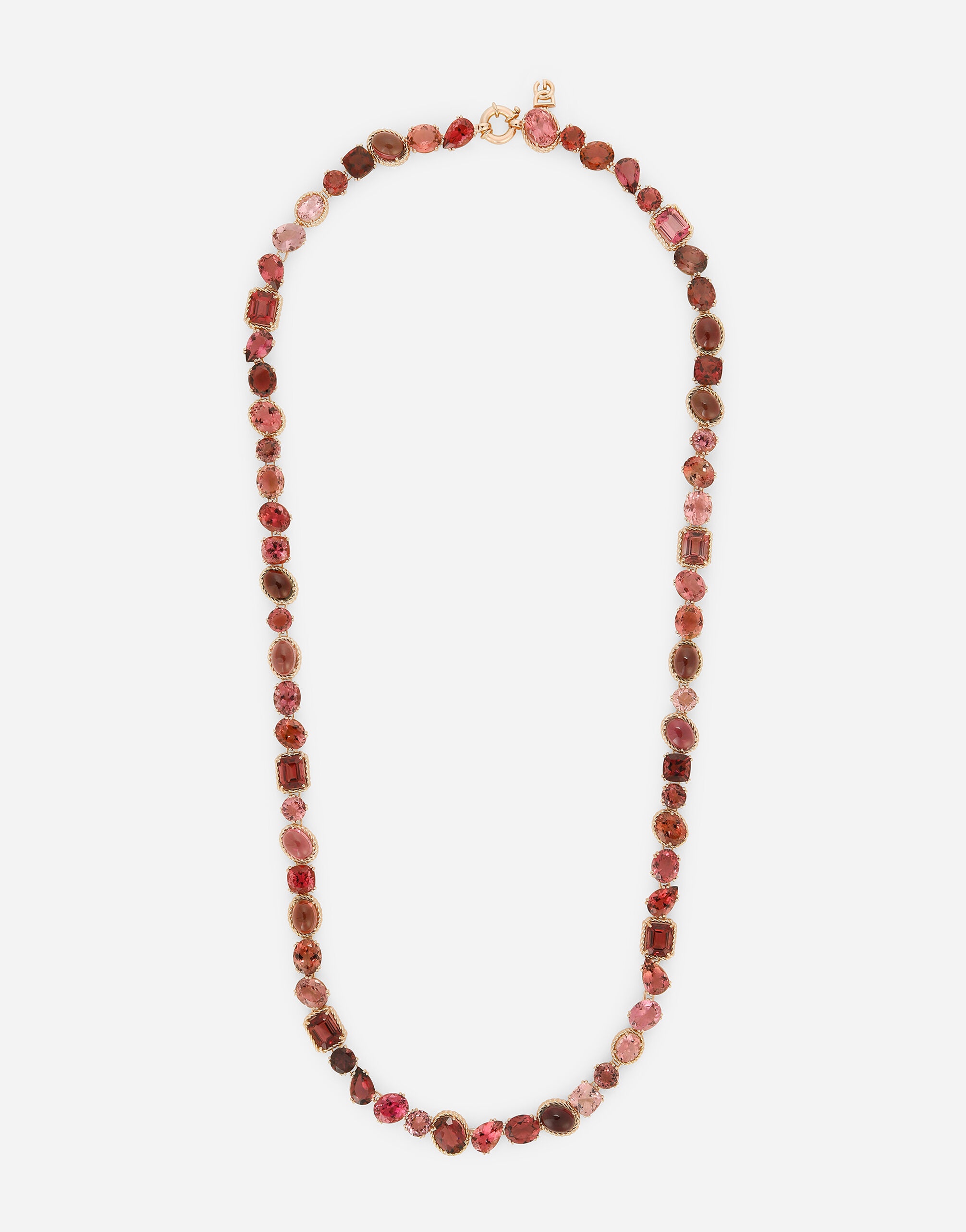 Sautoir made of a chain with 68 tourmalines in different shades, cuts, and settings, linked in such a way as to create a carefully crafted curve. The “DOLCE&GABBANA” logo has been placed on the back. Technical features: 18 Kt red gold Length: Total length: 77 cm Gems: 12 tourmalines: round shape 6 tourmalines: oval shape 6 tourmalines: square shape 8 tourmalines: pear shape 10 cabochon tourmalines 6 step-cut tourmalines Made in Italy 18kt red gold