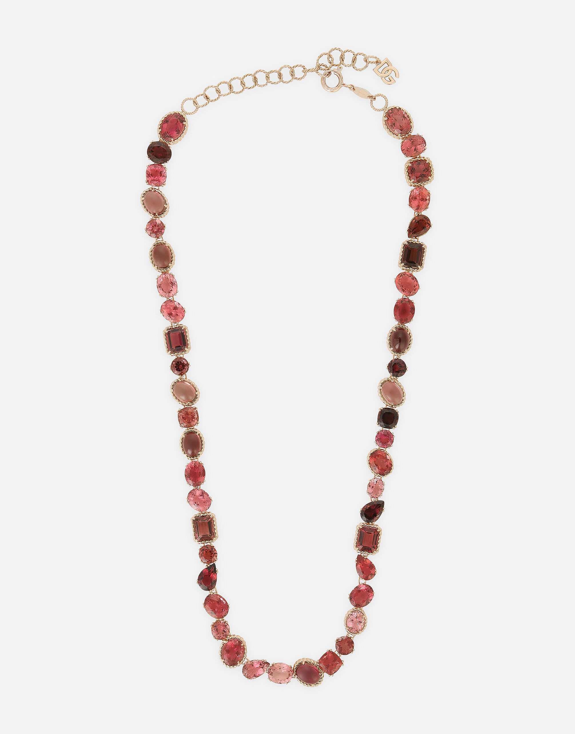 Necklace made of a chain with twisted wire rings and 46 tourmalines in different shades, cuts, and settings, connected to create a carefully crafted curve. The DG logo has been added as the end of the adjustable chain, while an oval tag with the logo “DOLCE&GABBANA” has been placed near the closure. Technical features: 18 Kt red gold Length: 52 + 12 cm adjustable Gems: 7 tourmalines: round shape 18 tourmalines: oval shape 5 tourmalines: square shape 5 tourmalines: pear shape 7 cabochon tourmalines 4 step-cut tourmalines Made in Italy 18kt red gold