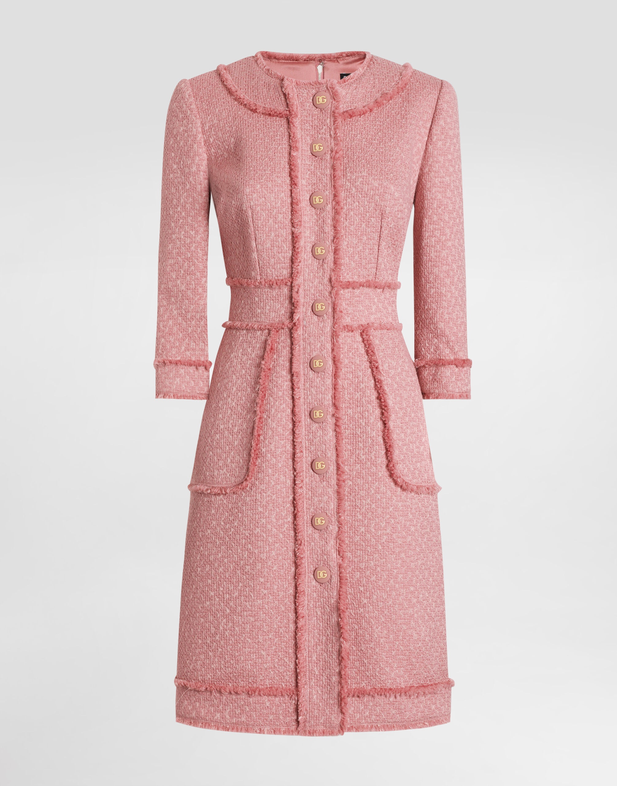 The Women’s DNA Collection is introducing a new side to femininity, which comes in shades of rose quartz, poised between sheerness and opacity, lightness and structure, formality and sensuality. Geometric Dolce Jackets, jacquard pajamas and floral brocade dresses intertwine with ultra-romantic designs. The DG print becomes an iconic statement, while Cordonetto lace and hints of Sicily Black embody the essence of a determined yet romantic femininity. Wool raschel tweed A-line shirt dress: • Pink • Round neckline • 3/4 sleeves • Tonal stretch silk satin lining • Rear zipper and hook-and-eye fastening • The piece measures 55 cm from the waist down on a size IT 40 • The model is 175 cm tall and wears a size IT 40 • Made in Italy External composition: 67% Virgin Wool 27% Viscose 06% Polyamide Internal composition: 92% Silk 08% Spandex