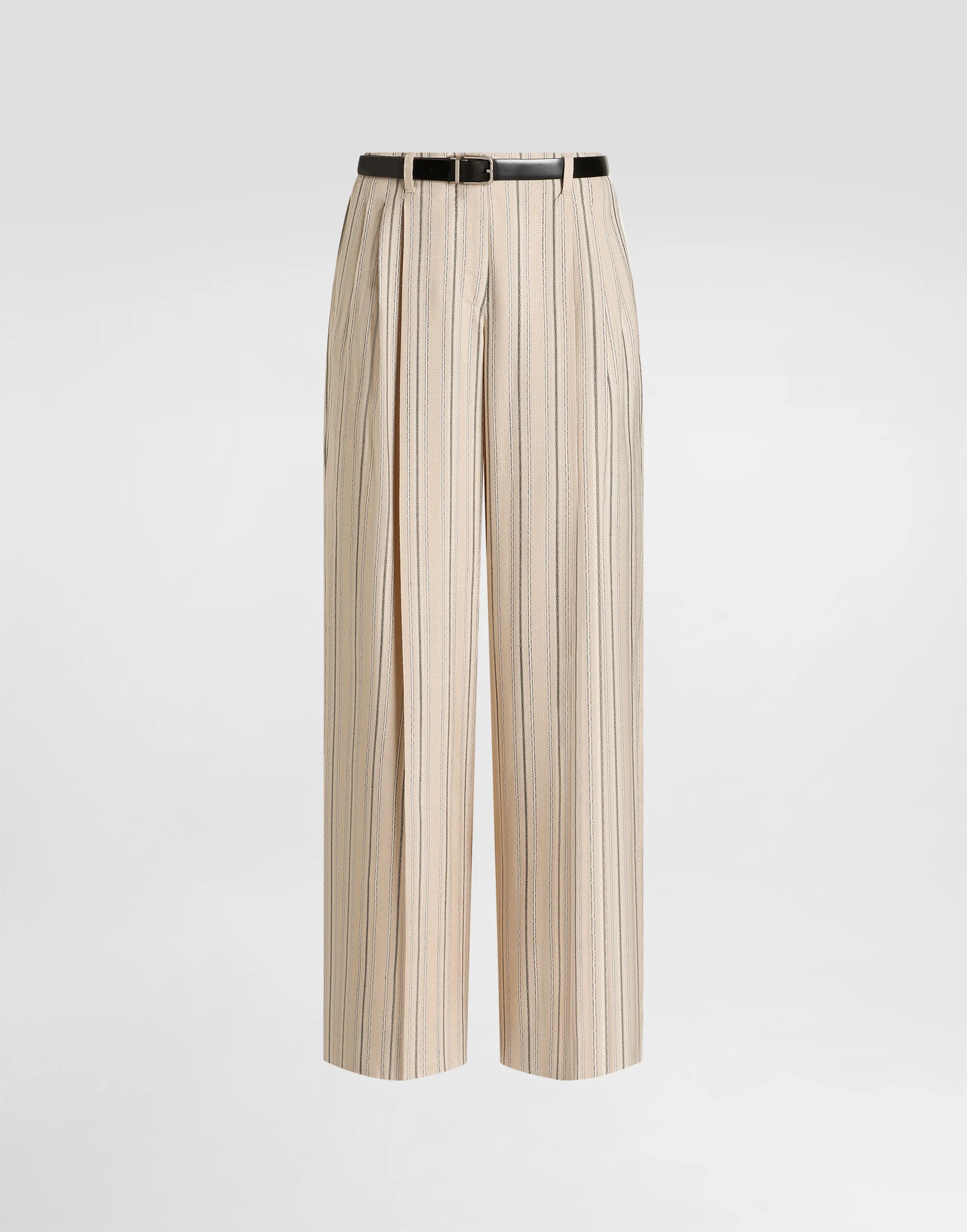 The SS26 Women's Fashion Show Collection is the result of a play of harmonious contrasts: masculine and feminine, day and evening, tailored and casual. Pyjamas take centre stage, paired with lingerie and formal garments. The play of layers and the mix of different influences contribute to expressing the relaxed attitude and unique, original style at the heart of the collection. These classic trousers with a masculine cut, crafted in refined regimental pinstripe fabric, combine elegance and comfort in a single piece. Perfect for those seeking timeless style with a contemporary touch. Regimental pinstripe trousers: • Multi-colored • Three front pleats • French pocket • Single-welt back pocket • Matching belt • Hook waist closure • The model is 175 cm tall and wears size 40 IT • Made in Italy External Composition: 100% Viscose