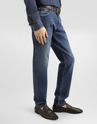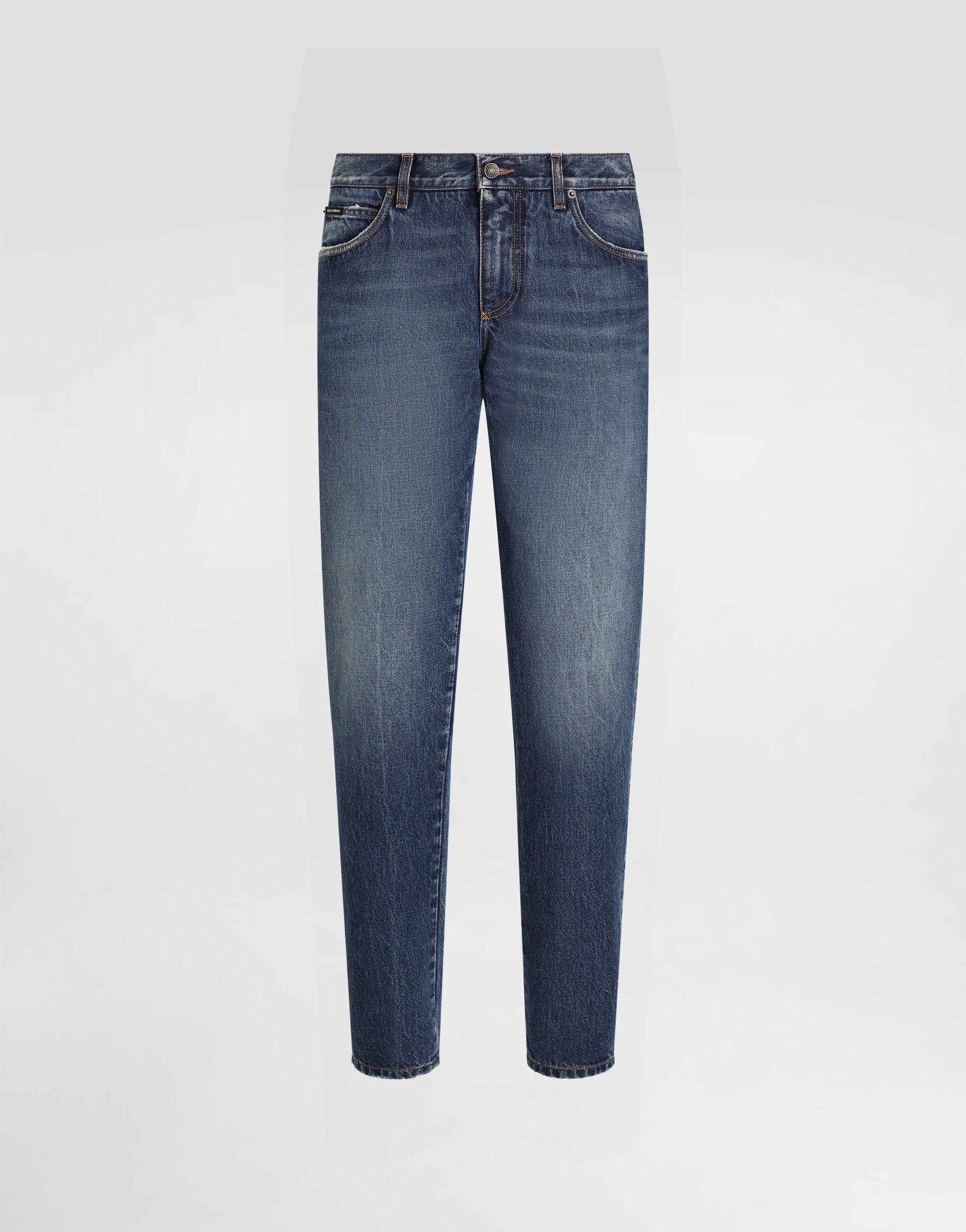 The Italian Holiday Men's Collection revisits 1950s style with a blend of relaxed fits and modern flair. Classic white shirts and tailored suits in refined fabrics contrast with casual denim and playful T-shirts featuring retro graphics with a futuristic twist. Bold prints—chessboards, cats, elegant lighters, and Mediterranean blue ribbons—alongside logo jacquard inspired by ties, infuse a contemporary edge into the essence of Italian holidays. Five-pocket slim-fit jeans in stretch cotton: • Blue • Regular fit • Fly-covered zipper and button fastening • Metal Dolce&Gabbana logo tag on the back • The item measures 105 cm on the outer leg and the hem is 17.5 cm wide on a size IT 48 • Made in Italy External composition: 100% Cotton