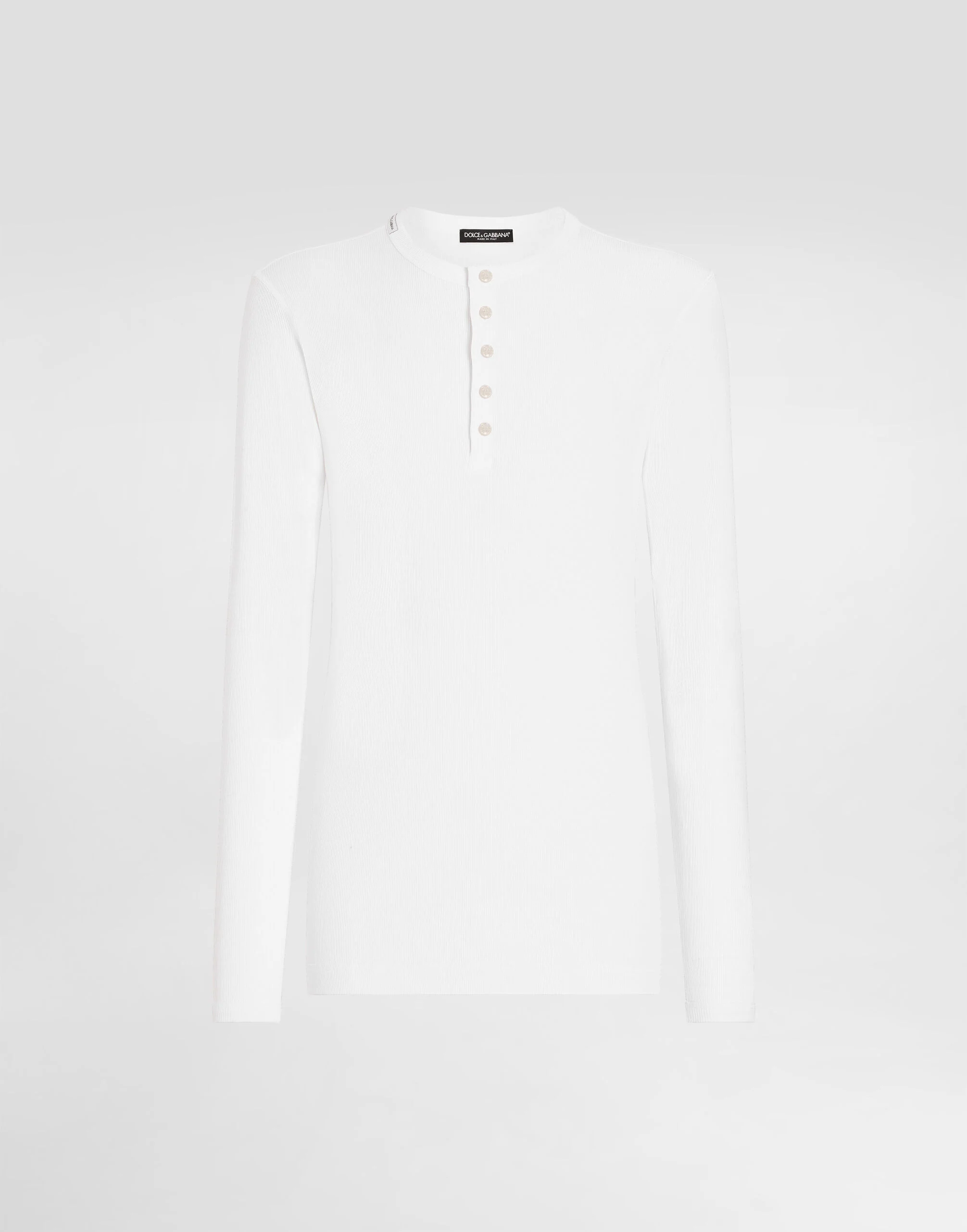 The “Continuative” Collection is the modern men’s closet designed by Dolce&Gabbana. A range of timeless, iconic pieces developed across all product categories. Ribbed cotton granddad-neck sweater: • White • Slim fit • 5-button fastening • Long sleeves • The piece measures 75 cm from the shoulder seam on a size IT 48 • Made in Italy External composition: 100% Cotton