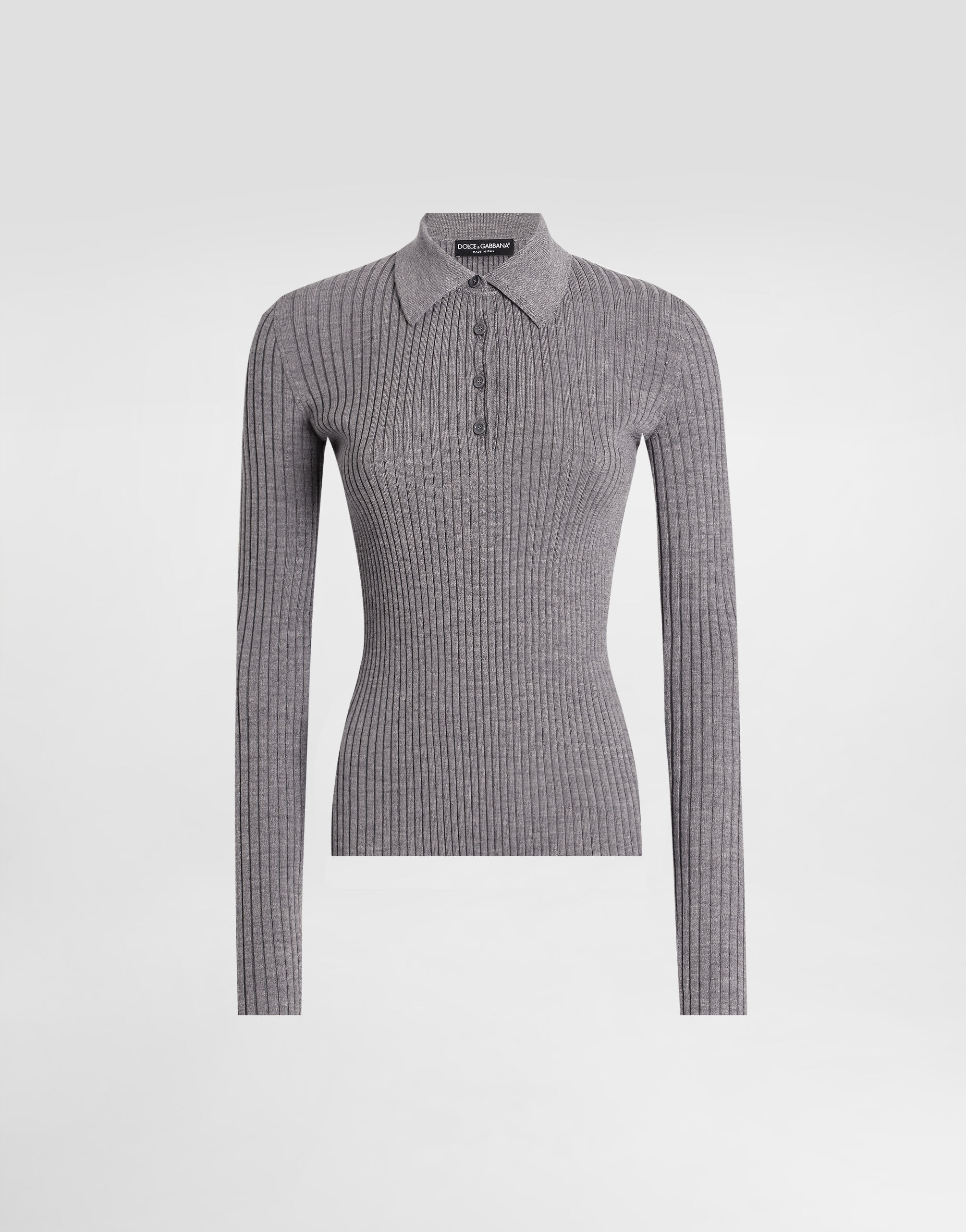 This ribbed virgin wool pullover is the perfect addition to any woman's wardrobe, combining elegance and comfort for an ideal fit on cooler days. Ribbed wool pullovers: • Grey • Polo-shirt collar • Long sleeves • Bottom width 60 cm on size 40 IT • The model is 175 cm tall and wears size 40 IT • Made in Italy External Composition: 50% Virgin Wool, 40% Polyamide, 10% Elastane