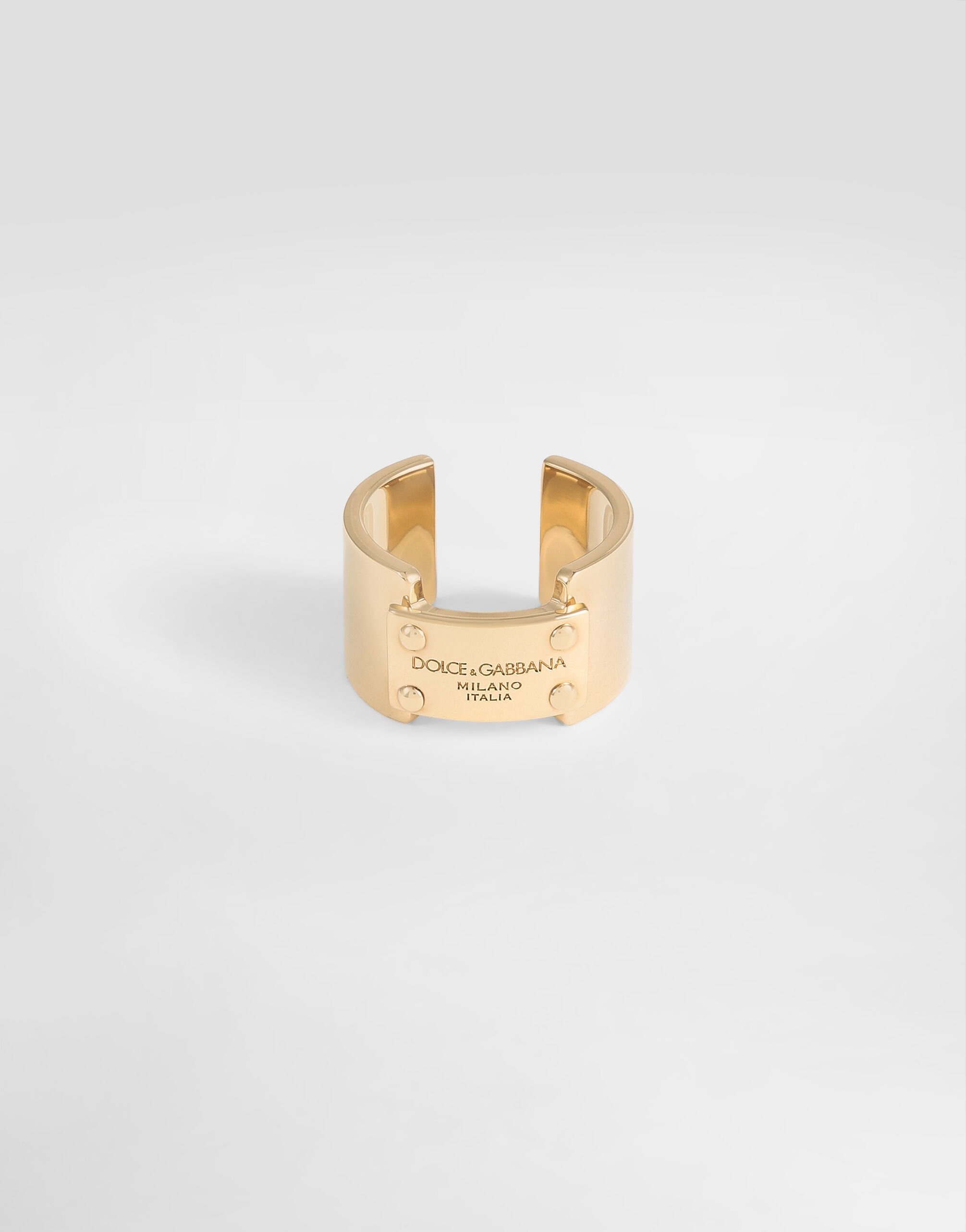 Gold and black: the iconic shades of Dolce&Gabbana color the Holiday Package Collection, capturing magnetic charm, timeless elegance, and sophisticated allure. Refined lines and exquisite details perfectly convey the magic of the festive season. Glossy, shimmering textures like lame jersey, thermostrass mesh, and sequins create looks that are sure to make a statement. Open metal ring with Dolce&Gabbana logo tag: • Gold • Height: 1.50 cm • Nickel-free and hypoallergenic materials • Made in Italy External composition: 100% Brass