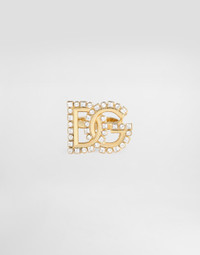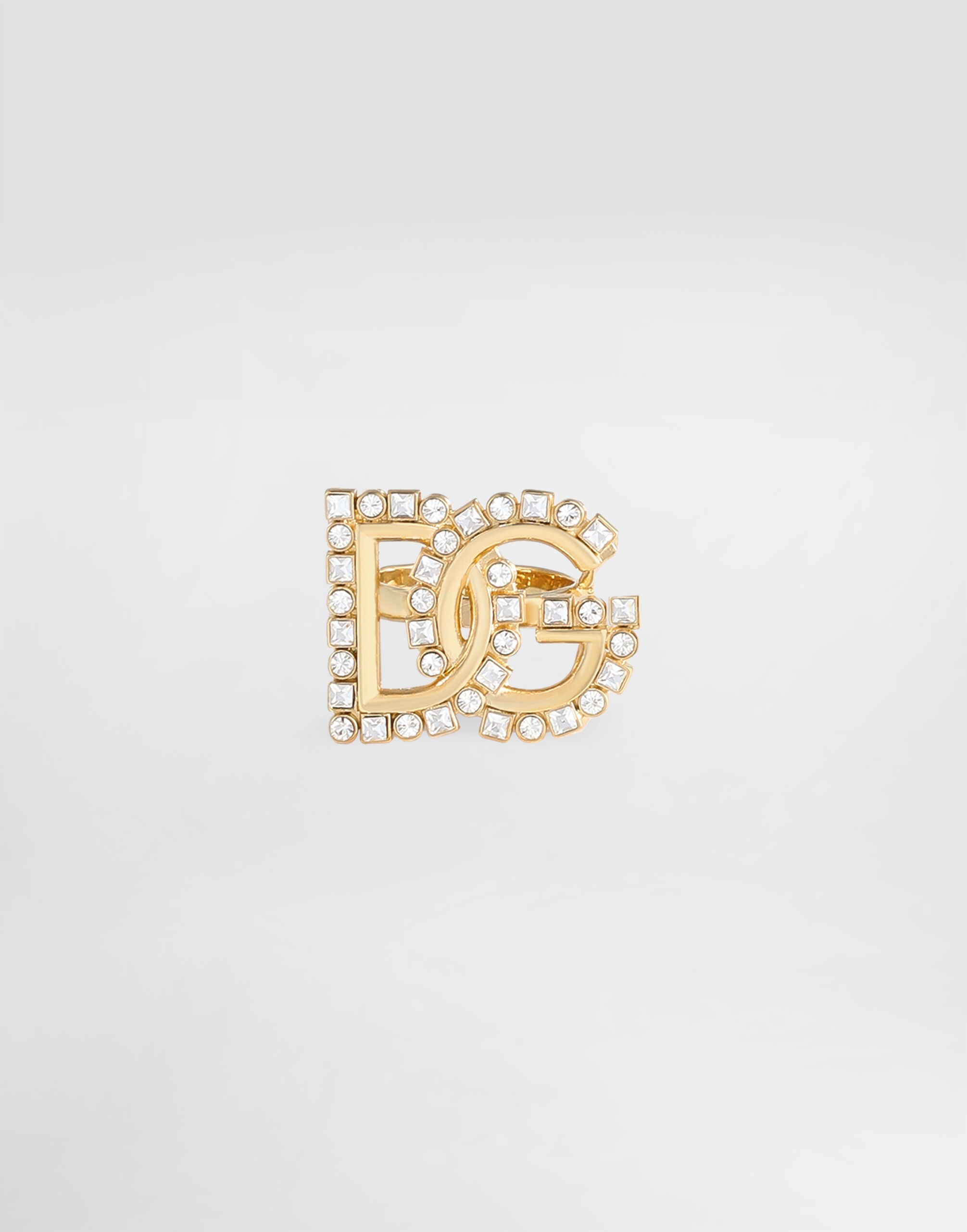 The Everyday Women's Collection reimagines contemporary daily wear with Dolce&Gabbana's signature style codes. Iconic fabrics mix with standout details like embroidered flowers, crystals, and jewel buttons, infusing elegance into every look. Gray animal print accented with green and purple, hyper-geometric jewelry, voluminous shapes and transparencies add unique touches. Men's tweed is reinvented with graphic twists, creating distinctive pieces that reflect refined sensuality. Ring with rhinestone-detailed DG logo: • Gold • Width: 3 cm • Height: 2.5 cm • Nickel-free and hypoallergenic materials • Engraved logo • Made in Italy Composition: 90% Brass 10% Glass
