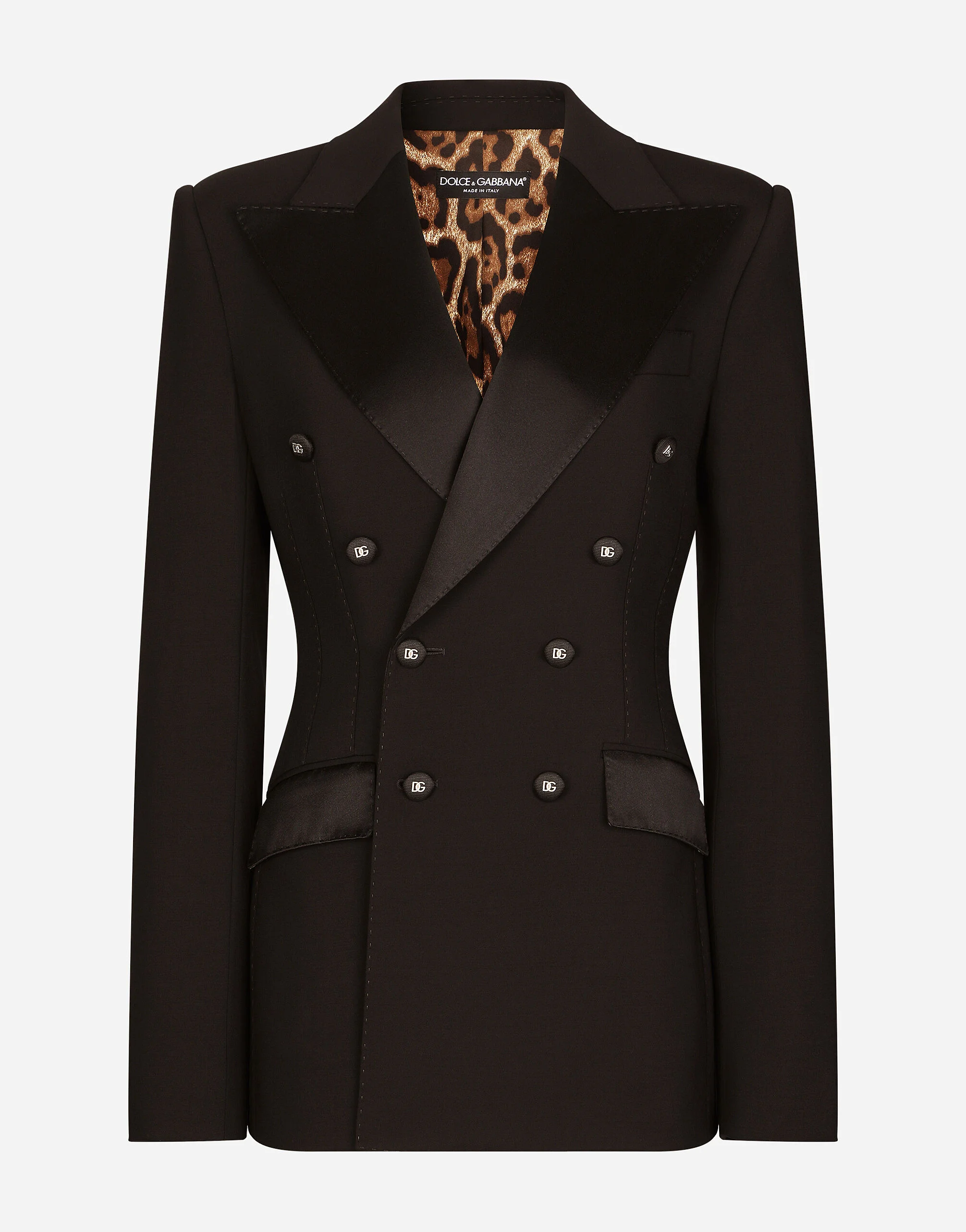 Satin and duchesse tuxedo jacket: • Duchesse peak lapels • Long sleeves • Pockets with duchesse flap • Leopard-print stretch satin lining • Canneté-covered button fastenings and DG logo • The piece measures 70 cm from the rear collar seam on a size IT 40 • The model is 175 cm tall and wears a size IT 40 • Made in Italy Care And Details External composition: 81% Virgin Wool 14% Silk 4% Polyester 1% Spandex Internal composition: 97% Polyester 3% Spandex