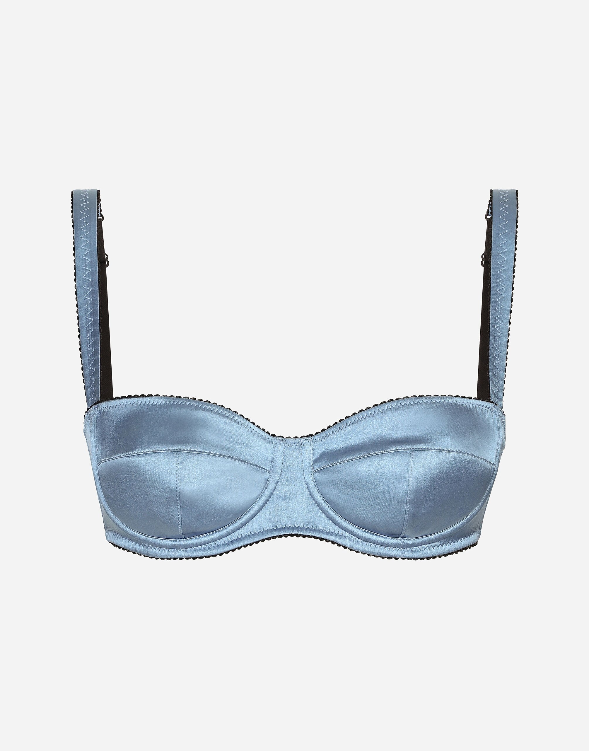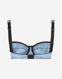 The lingerie collection is a mix of elegant and sensual pieces that flaunt timeless and ageless feminine allure, the distinctive, unmistakable feature of the Dolce&Gabbana woman. Satin balconette bra with contrasting stretch trim: • Light blue • Underwired cups and a half-moon insert with light even padding • Straps with branded buckles • Adjustable, 2-position hook-and-eye fastenings on the back • Made in Italy External composition: 94% Silk 6% Spandex Internal composition: 94% Silk 6% Spandex