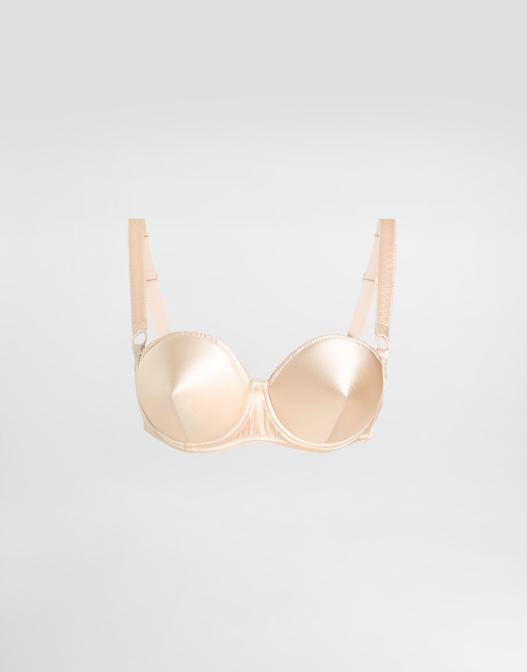 The Spring/Summer 2025 Women’s Collection is celebrating Italian beauty through bold and charismatic femininity. The 50s-inspired lingerie is the star, intermingling with fitted dresses, corsets and oversize trench coats. The iconic jackets have been updated with cropped cuts and modern inserts, while the floral prints add a romantic edge. The eveningwear shines with light fabrics and crystals, accompanied by look-defining accessories, from iconic bags to the cross earrings. Stretch silk satin balconette bra with conical cups: • Beige • Fully padded conical cups • Stretch straps with branded adjustable details • Adjustable, 2-position hook-and-eye fastenings on the back • Made in Italy External composition: 94% Silk 06% Spandex Internal composition: 94% Silk 06% Spandex