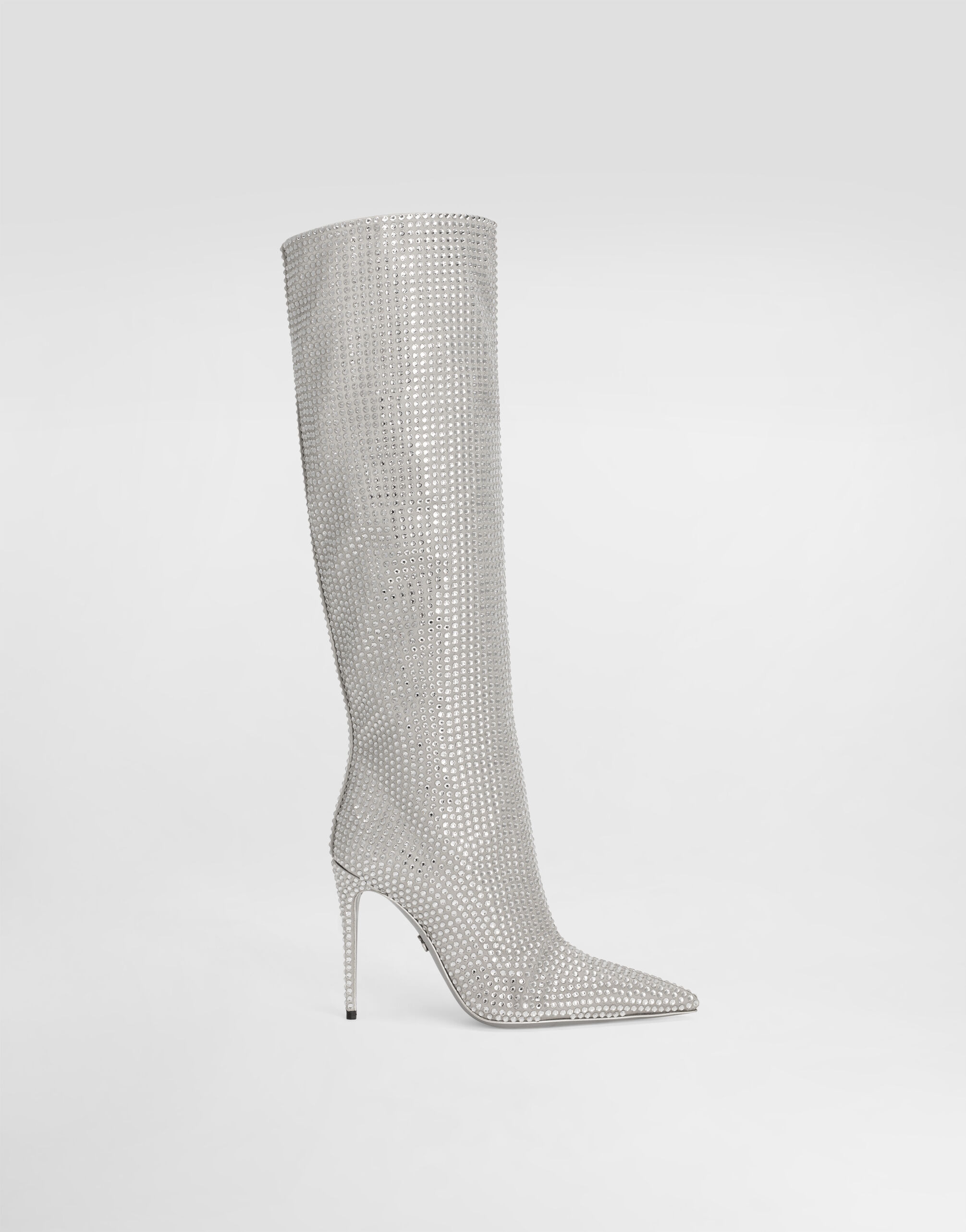 Satin Lollo boots with all-over rhinestone embellishment: • Fusible rhinestones on the satin upper • 105-mm heel • Kidskin insole with branded label • Foiled leather sole with logo • Made in Italy Care And Details External composition: 68% Viscose 32% Silk Internal composition: 61% Lambskin 39% Goatskin