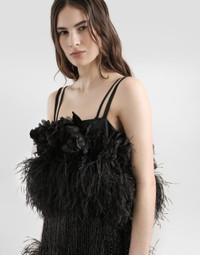 In the Fall/Winter 2025 Fashion Show Collection, shearling jackets, in fur-free versions, reveal slip dresses and create contrast' plays while denim welcomes fabric or Leo print inserts. Sweatshirts are the result of long experimentation with volumes. Evening looks become precious thanks to dresses with special embroideries and luminous touches of sequins and crystals. Sheepskin inserts also unite hats, shoes, and bags, including those with pockets. This dress is perfect for elegant evenings, with its bold design and refined details. A garment that combines the sensuality of satin with the lightness of feathers, for a touch of irresistible glamour. Satin dress with feathers: • Black • With straps • Chain motif with rhinestones and ostrich fringes • Hip pockets • Covered central zipper • The model is 175 cm tall and wears size 40 IT • Made in Italy External Composition: 65% Acetate, 29% Polyamide, 6% Elastane Internal Composition: 92% Silk, 08% Elastane