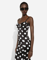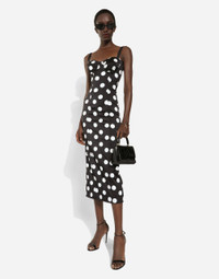 In the Black Sicily Collection, black, the absolute protagonist, becomes sensual black, sheer black, Dolce&Gabbana black. The key concept is “Black on Black”. Playing around with proportions, volumes, layered fabrics and sheer details, this style becomes absolute, bold and sexy. Unique and unmistakable, it is conveyed through the contrasts between glossy and matte fabrics, lines, volumes and special details, thereby expressing a woman’s various personalities and the true identity of Dolce&Gabbana. Stretch satin midi dress with polka-dot print and corset details: • Black • Sweetheart neckline • Sleeveless with adjustable stretch straps • Underwired cups • Covered slit on the center back • Leopard-print stretch silk satin lining • Rear zipper and hook-and-eye fastenings • The piece measures 82 cm from the waist down on a size IT 40 • The model is 175 cm tall and wears a size IT 40 • Made in Italy External composition: 91% Viscose 5% Silk 4% Spandex Internal composition: 92% Silk 8% Spandex