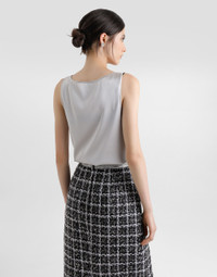 The Everyday Women's Collection reimagines contemporary daily wear with Dolce&Gabbana's signature style codes. Iconic fabrics mix with standout details like embroidered flowers, crystals, and jewel buttons, infusing elegance into every look. Gray animal print accented with green and purple, hyper-geometric jewelry, voluminous shapes and transparencies add unique touches. Men's tweed is reinvented with graphic twists, creating distinctive pieces that reflect refined sensuality. Silk satin tank top with the metal DG logo pin: • Gray • Round neckline • Sleeveless • Regular fit • The piece measures 57.5 cm from the center back on a size IT 40 • The model is 175 cm tall and wears a size IT 40 • Made in Italy External composition: 93% Silk 07% Spandex