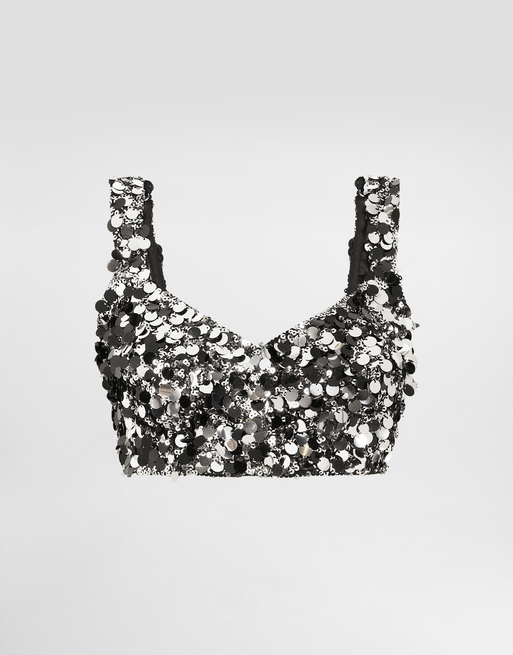 The Everyday Women's Collection reimagines contemporary daily wear with Dolce&Gabbana's signature style codes. Iconic fabrics mix with standout details like embroidered flowers, crystals, and jewel buttons, infusing elegance into every look. Gray animal print accented with green and purple, hyper-geometric jewelry, voluminous shapes and transparencies add unique touches. Men's tweed is reinvented with graphic twists, creating distinctive pieces that reflect refined sensuality. Sequined bralette top: • Silver • Sweetheart neckline • Sleeveless with shoulder straps • Tonal stretch silk satin lining • Elasticated marquisette on the back • Hook-and-bar fastenings on the back • The model is 175 cm tall and wears a size IT 40 • Made in Italy External composition: 66% Polyester 25% Polyamide 09% Spandex Internal composition: 92% Silk 8% Spandex