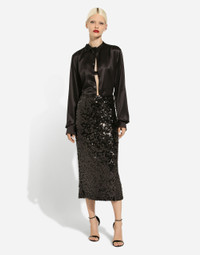 The Holiday collection is an extraordinary story that brings together two worlds: Dolce&Gabbana and the great stars from Hollywood’s Golden Age, who were recognized and admired for their wonderful dresses and extraordinarily glamorous looks. The designers are reinventing and making us dream in front of tailored pieces with breathtaking elegance and visual impact, a sparkling mood that will give everyone a modern, recognizable and unique allure on any occasion. Sequined calf-length pencil skirt: • Black • Low rise • Stretch silk satin lining • Rear vent • Rear zipper and hook-and-eye fastening • The piece measures 80 cm from the waist down on a size IT 40 • The model is 175 cm tall and wears a size IT 40 • Made in Italy External composition: 94% Polyamide 6% Spandex Internal composition: 92% Silk 8% Spandex