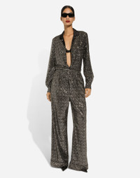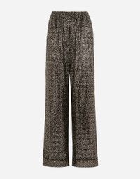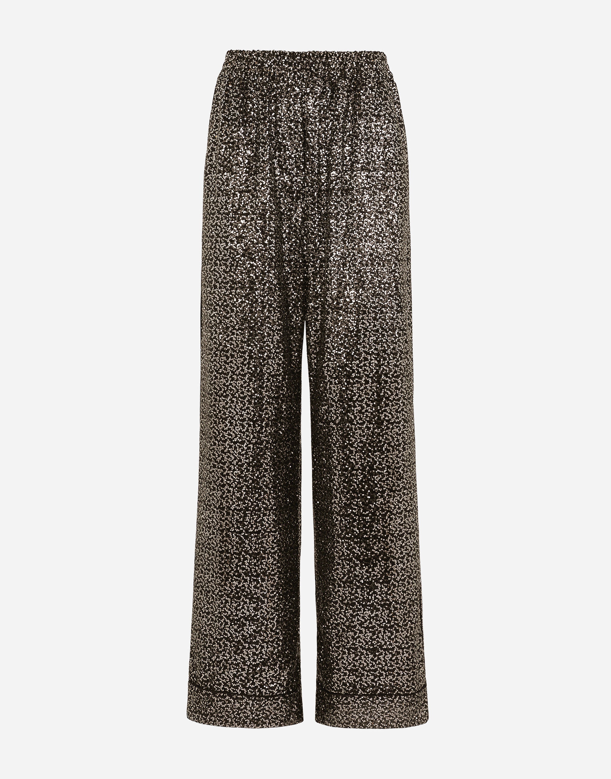 The Holiday collection is an extraordinary story that brings together two worlds: Dolce&Gabbana and the great stars from Hollywood’s Golden Age, who were recognized and admired for their wonderful dresses and extraordinarily glamorous looks. The designers are reinventing and making us dream in front of tailored pieces with breathtaking elegance and visual impact, a sparkling mood that will give everyone a modern, recognizable and unique allure on any occasion. Micro-sequined pajama pants: • Silver • Stretch waist with elasticated back • Front slant pockets • Stretch silk crepe de chine lining • Inner leg: 77 cm • Hem: 30 cm • The model is 175 cm tall and wears a size IT 40 • Made in Italy External composition: 95% Polyester 5% Silk Internal composition: 91% Silk 9% Spandex