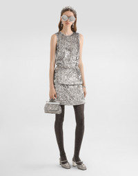 Elegance, tailored lines and sparkling details define the Dolce&Gabbana Holiday collection. Sixties inspirations blend with a contemporary aesthetic. For him, structured jackets and cuts that enhance the silhouette for her, silver brocade and crystals illuminate festive looks. Each piece stands out for its fine materials, attention to detail and distinctive style. This low-rise skirt is a bold and sparkly piece that is perfect for those who like to stand out. Made with silver sequins, it is ideal for glamorous evenings and special occasions, where elegance meets the charm of contemporary fashion. Sequined skirt: • Silver • Low-waisted • 4 cm high belt • Center back zip closure • Lined • Length from waist without belt is 43 cm on size 40 IT • Made in Italy External composition: 100% Polyester Internal composition: 92% Silk, 8% Elastane