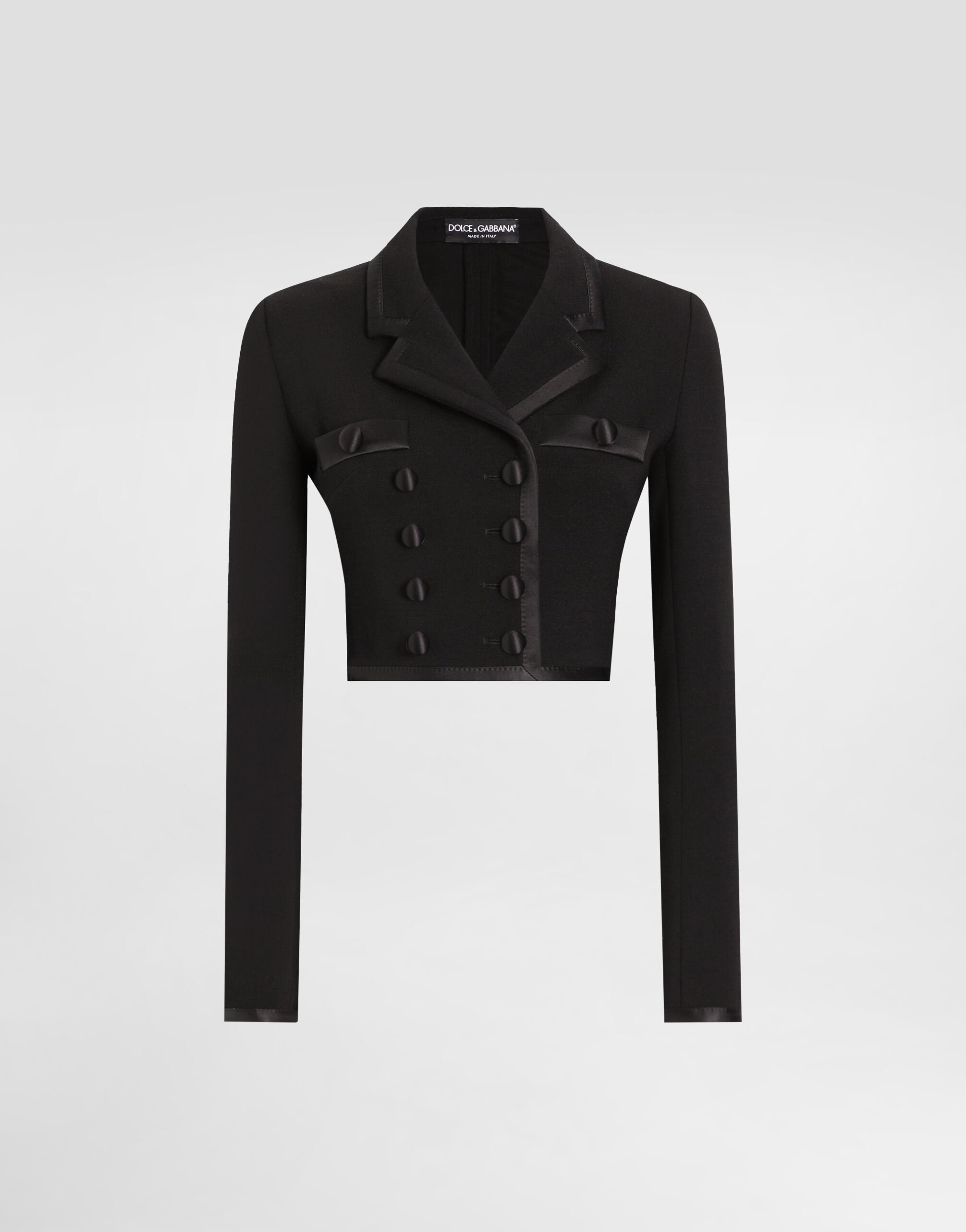 The Spring/Summer 2025 Women’s Collection is celebrating Italian beauty through bold and charismatic femininity. The 50s-inspired lingerie is the star, intermingling with fitted dresses, corsets and oversize trench coats. The iconic jackets have been updated with cropped cuts and modern inserts, while the floral prints add a romantic edge. The eveningwear shines with light fabrics and crystals, accompanied by look-defining accessories, from iconic bags to the cross earrings. Short double-breasted stretch wool crepe jacket with duchesse satin trims: • Black • Notched lapels • Long sleeves • Patch pockets • Tulle lining • Satin-covered button fastenings • The piece measures 40 cm from the rear collar seam on a size IT 40 • The model is 175 cm tall and wears a size IT 40 • Made in Italy External composition: 83% Virgin Wool 11% Silk 3% Polyester 2% Polyamide 1% Spandex Internal composition: 90% Polyamide 07% Acetate 03% Silk