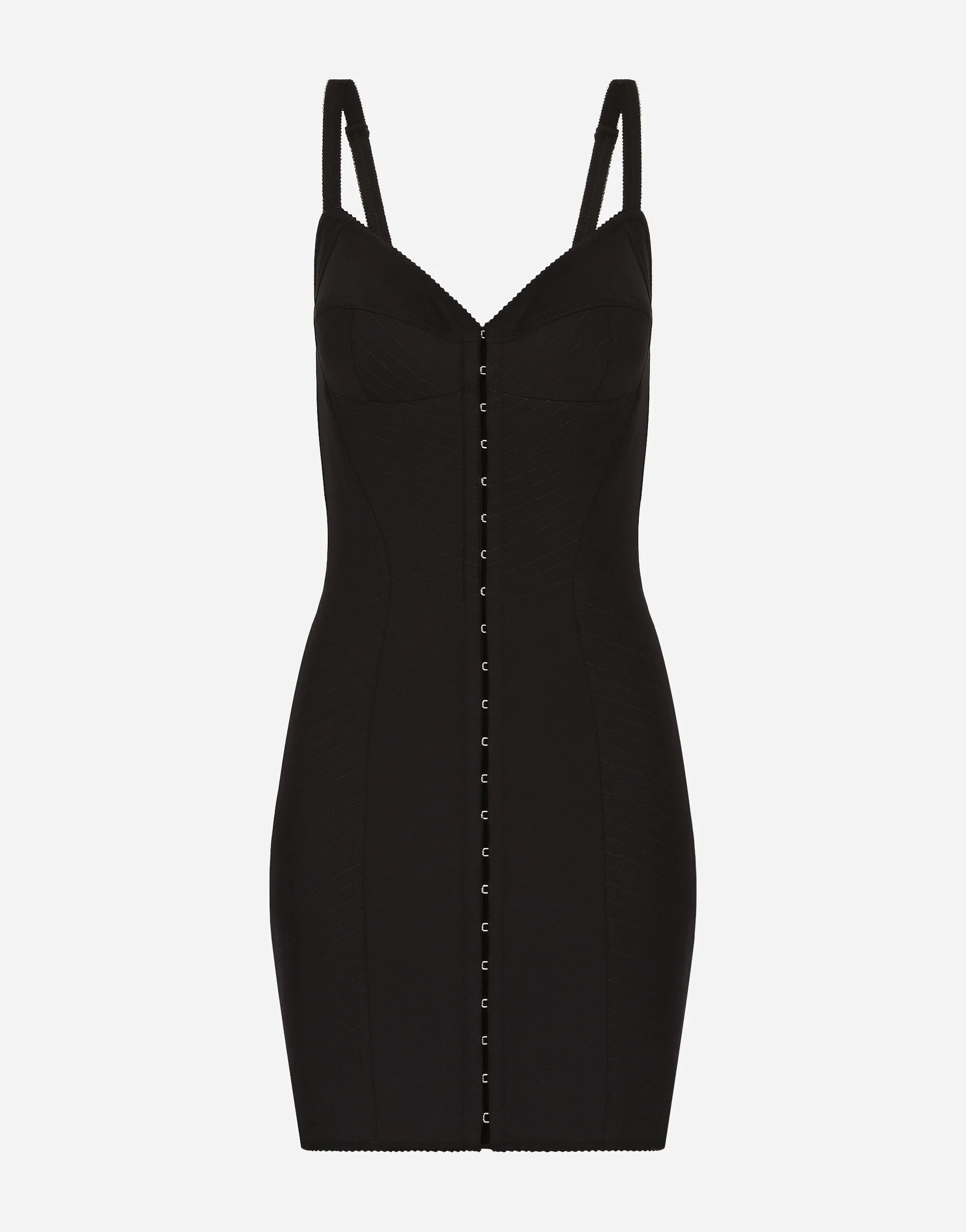 Short corset dress in light stretch technical jersey: • Black • Sweetheart neckline • Sleeveless with adjustable stretch straps • Unlined • Rear zipper and hook-and-eye fastening • The piece measures 40 cm from the waist down on a size IT 40 • The model is 175 cm tall and wears a size IT 40 • Made in Italy Care And Details External composition: 86% Polyamide 14% Spandex