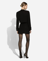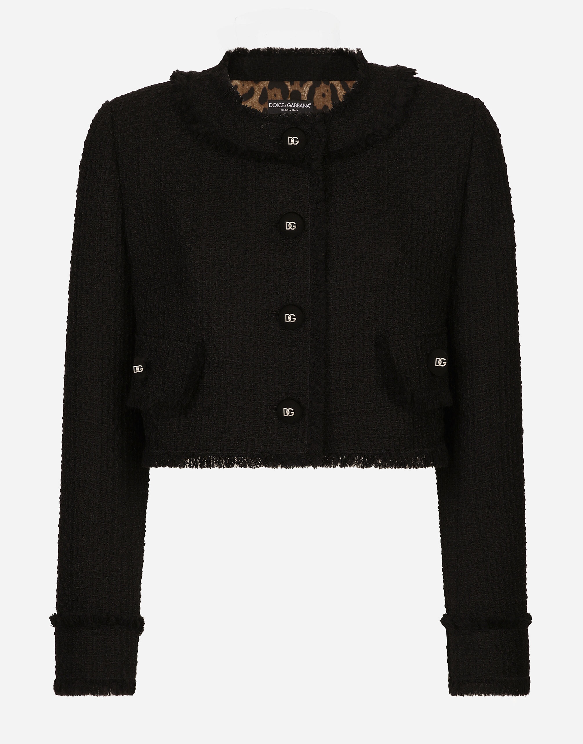 The DNA collection is distinguished by timeless shapes, bringing together three concepts: Sicilian flair, tailoring and sensuality. Nero Sicilia black and optical white predominate and pair with colors that catapult us onto the island of Sicily and make us dream. The designers channel the timeless wardrobe made up of creations that are instantly unmistakable in their simplicity, presenting us with sophisticated beauty loaded with meaning and symbolism that transcends fashion. Short raschel tweed jacket: • Black • Round neck • Long sleeves • Leopard-print stretch satin lining • Canneté-covered button fastenings and DG logo • The piece measures 40.5 cm from the center back on a size IT 40 • The model is 175 cm tall and wears a size IT 40 • Made in Italy External composition: 93% Wool 7% Polyamide Internal composition: 97% Polyester 3% Spandex
